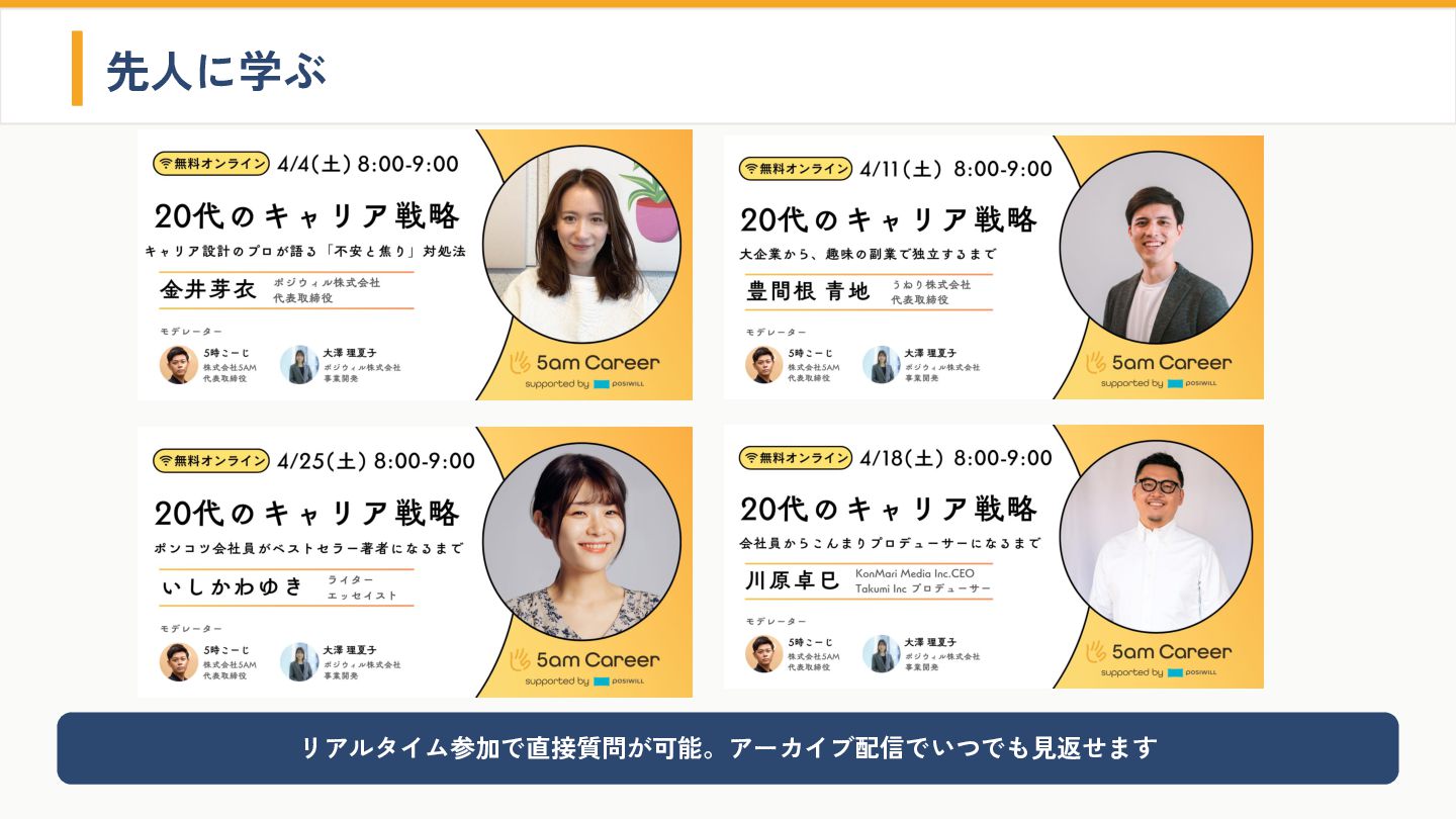 先人に学ぶ 理想の未来を歩む30〜40代ゲスト から、リアルなキャリア論や決断 のヒントを得る。同じ20代を悩み 抜いた先輩から「後悔のない選 択」を学ぶ。 🤝 同志と出会う 社内では相談しにくいことを社外 の仲間と共有。新しい気づきと、 続ける力を得る。一人では続かな いキャリア思考が、チームの力で 習慣になる。 朝という「ノイズのない時間」に、自分と向き合い続けることで、人生のオーナーシップを取り戻す。