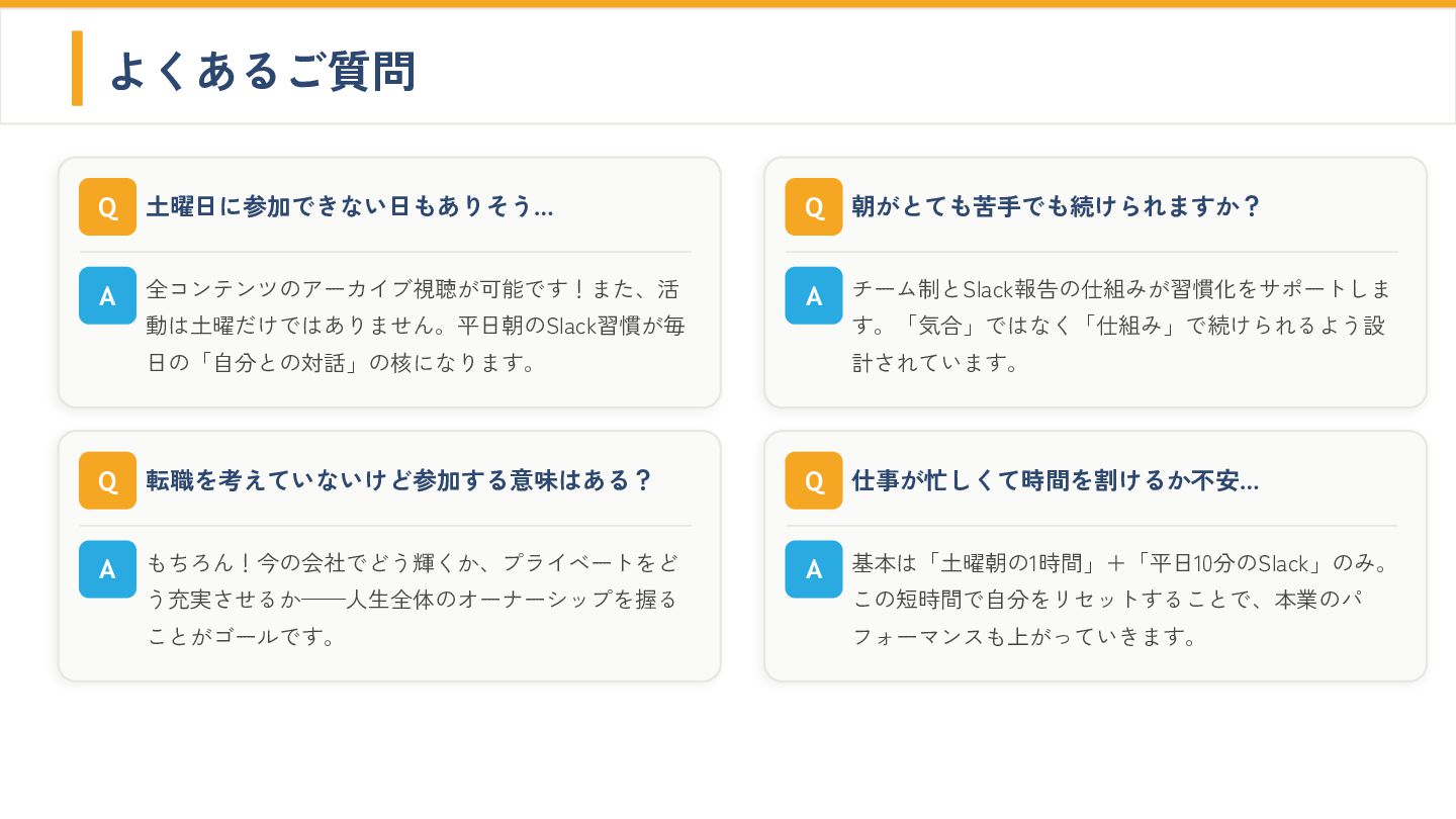 チーム制とSlack報告の仕組みが習慣化をサポートしま す。「気合」ではなく「仕組み」で続けられるよう設 計されています。 Q 転職を考えていないけど参加する意味はある? A もちろん!今の会社でどう輝くか、プライベートをど う充実させるか——人生全体のオーナーシップを握る ことがゴールです。 Q 仕事が忙しくて時間を割けるか不安… A 基本は「土曜朝の1時間」+「平日10分のSlack」のみ。 この短時間で自分をリセットすることで、本業のパ フォーマンスも上がっていきます。