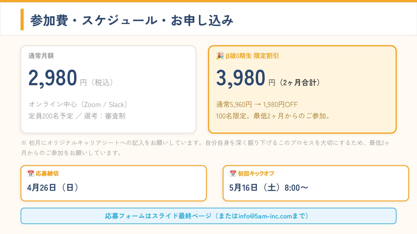 🎉 β版0期生 限定割引 3,980 円(2ヶ月合計) 通常5,960円 → 1,980円OFF 100名限定。最低2ヶ月からのご参加。 ※ 初月にオリジナルキャリアシートへの記入をお願いしています。自分自身を深く掘り下げるこのプロセスを大切にするため、最低2ヶ 月からのご参加をお願いしています。 📅 応募締切 4月26日(日) 📅 初回キックオフ 5月16日(土)8:00〜 応募フォームはスライド最終ページ(または