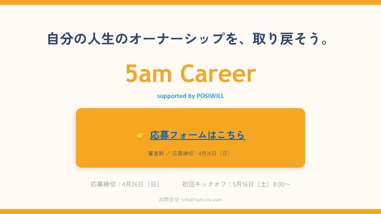 自分の人生のオーナーシップを、取り戻そう。 5am Career supported by POSIWILL 👉 応募フォームはこちら 審査制 /