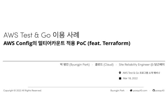 / ైݺೠ ࠁ ҕਬ ਯҗ ଼ — מز সޖ ࣻ೯ / ਯ ౸ױ ૌѩѱ ࢿ — աࠁ ڪযդ زܐ / ਕ / ૌѢ ࢎਊ ब ࢎҊ — ࢎਊ о ୭ࢶ / ࢎਊ৬ ࢲ োѾ recruiting SRE ীࢲ ਊীਃ! 👋 Byungjin Park · posquit0.com · posquit0 Copyright © 2022 All Rights Reserved. ࣁೠ ղਊ daangn.teamਸ ߑޙ೧ࣁਃ! :) ܻח ۧѱ ੌ೧ਃ ഌఖ ߂ ࠂ ਬ۽ ോо / ਬো ృӔ ߂ ఖӔޖ / धࢎ ߂ নೠ рध ઁҕ झగ٬ ؘझ৬ ೲݢ۞ ઁҕ / بࢲ ҳݒ ߂ Үਭ࠺ ਗ