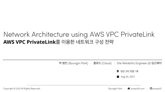Rights Reserved. Network Architecture using AWS VPC PrivateLink AWS VPC PrivateLinkܳ ਊೠ ֎ਕ ҳࢿ ۚ ߅ ߽ (Byungjin Park) · ۽٘ (Claud) · Site Reliability Engineer @ Ӕಕ Ӕ SRE স 1ഥ Aug 26, 2021