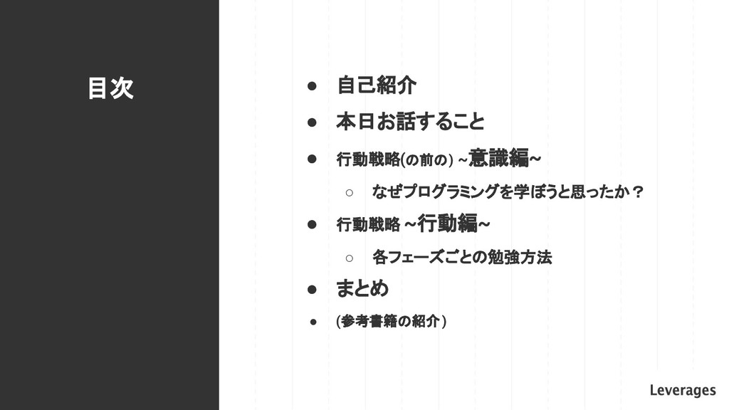 目次 • 自己紹介 • 本日お話すること • 行動戦略(の前の) ~意識編~ ◦ なぜプログラミングを学ぼうと思ったか?