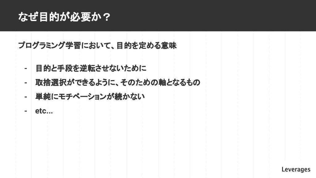 なぜ目的が必要か? プログラミング学習において、目的を定める意味 - 目的と手段を逆転させないために - 取捨選択ができるように、そのための軸となるもの - 単純にモチベーションが続かない - etc...