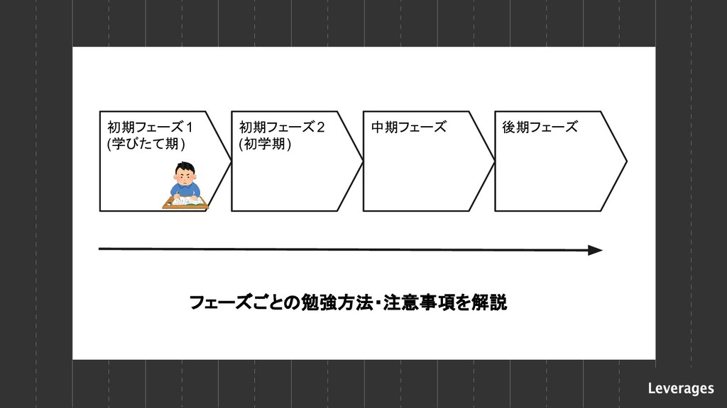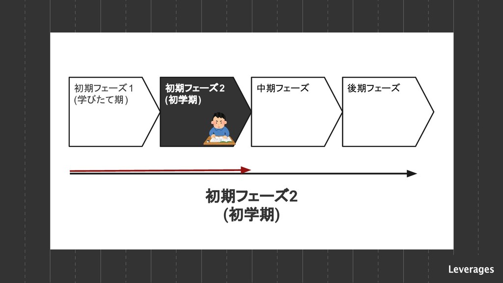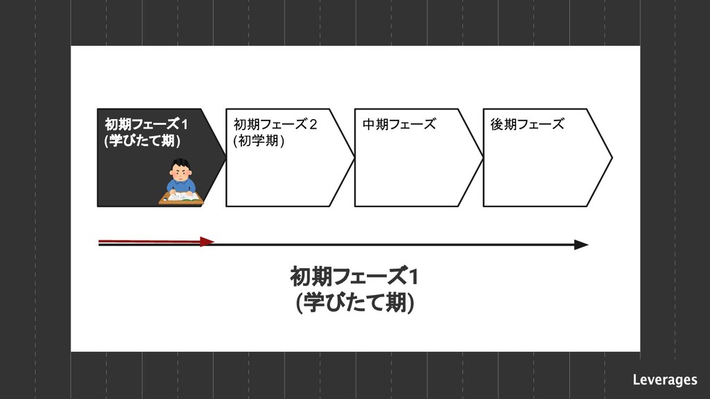 初期フェーズ1 (学びたて期) 初期フェーズ2 (初学期) 中期フェーズ 後期フェーズ 初期フェーズ2 (初学期)