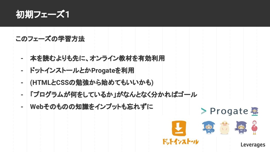 初期フェーズ1 このフェーズの学習方法 - 本を読むよりも先に、オンライン教材を有効利用 - ドットインストールとかProgateを利用 - (HTMLとCSSの勉強から始めてもいいかも) - 「プログラムが何をしているか」がなんとなく分かればゴール