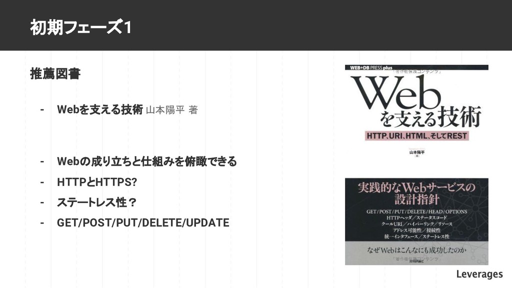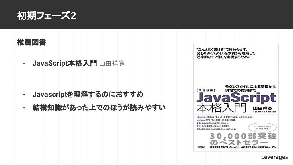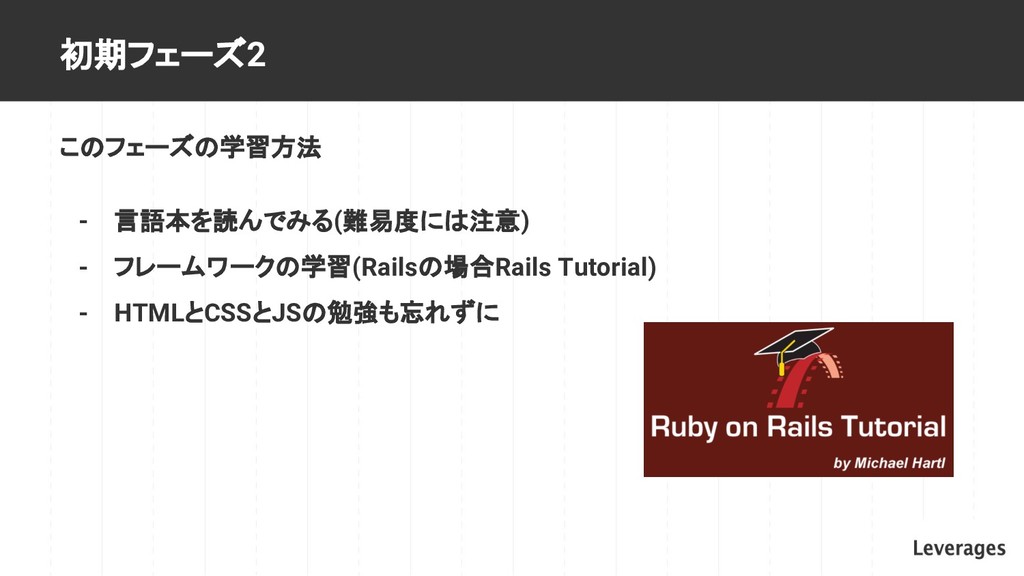 初期フェーズ2 このフェーズの学習方法 - 言語本を読んでみる(難易度には注意) - フレームワークの学習(Railsの場合Rails Tutorial) - HTMLとCSSとJSの勉強も忘れずに
