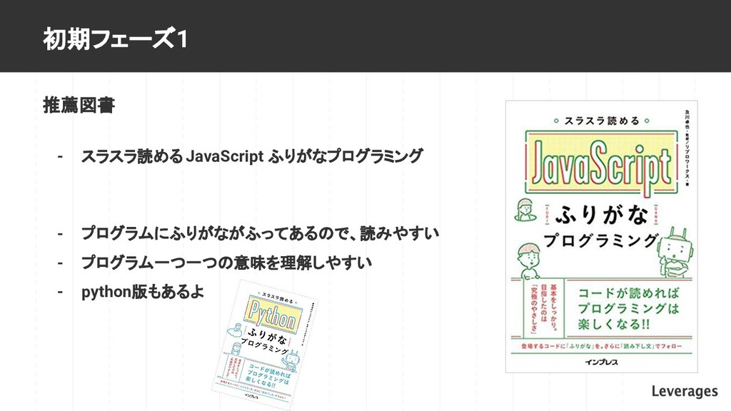 初期フェーズ1 推薦図書 - スラスラ読める JavaScript ふりがなプログラミング - プログラムにふりがながふってあるので、読みやすい - プログラム一つ一つの意味を理解しやすい
