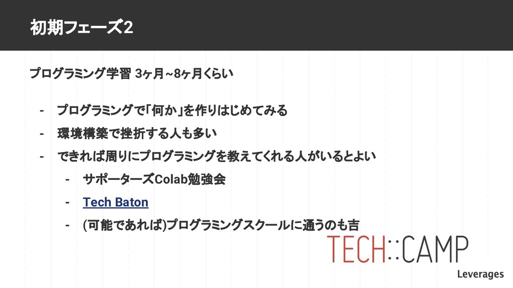 初期フェーズ2 プログラミング学習 3ヶ月~8ヶ月くらい - プログラミングで「何か」を作りはじめてみる - 環境構築で挫折する人も多い - できれば周りにプログラミングを教えてくれる人がいるとよい -