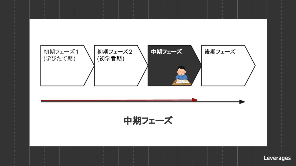 初期フェーズ1 (学びたて期) 初期フェーズ2 (初学者期) 中期フェーズ 後期フェーズ 中期フェーズ