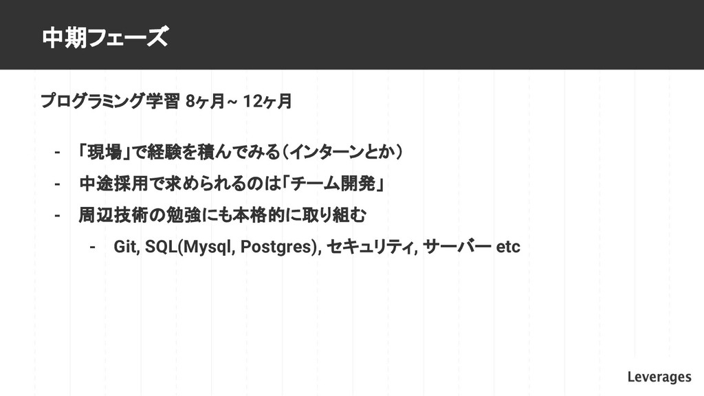 中期フェーズ プログラミング学習 8ヶ月~ 12ヶ月 - 「現場」で経験を積んでみる(インターンとか) - 中途採用で求められるのは「チーム開発」 - 周辺技術の勉強にも本格的に取り組む