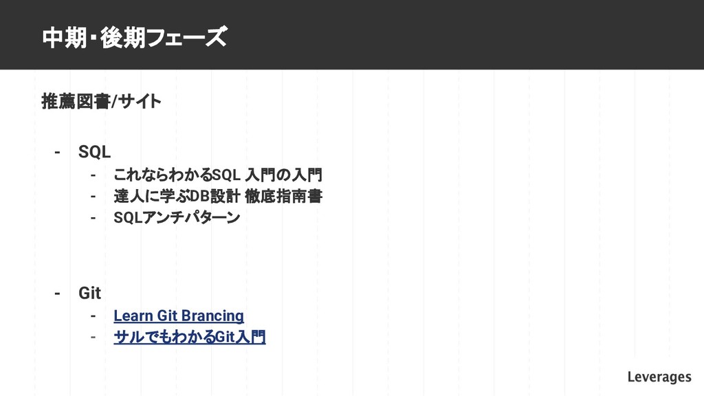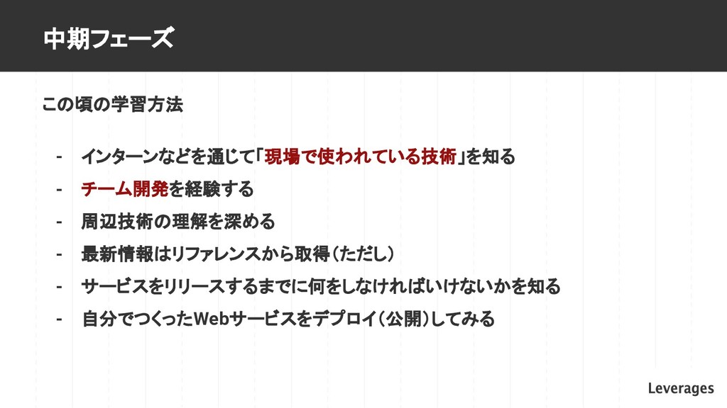 中期フェーズ この頃の学習方法 - インターンなどを通じて「現場で使われている技術」を知る - チーム開発を経験する - 周辺技術の理解を深める - 最新情報はリファレンスから取得(ただし)