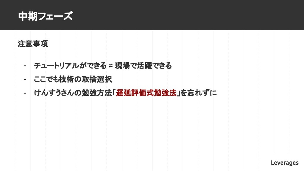 中期フェーズ 注意事項 - チュートリアルができる ≠ 現場で活躍できる - ここでも技術の取捨選択 - けんすうさんの勉強方法「遅延評価式勉強法」を忘れずに