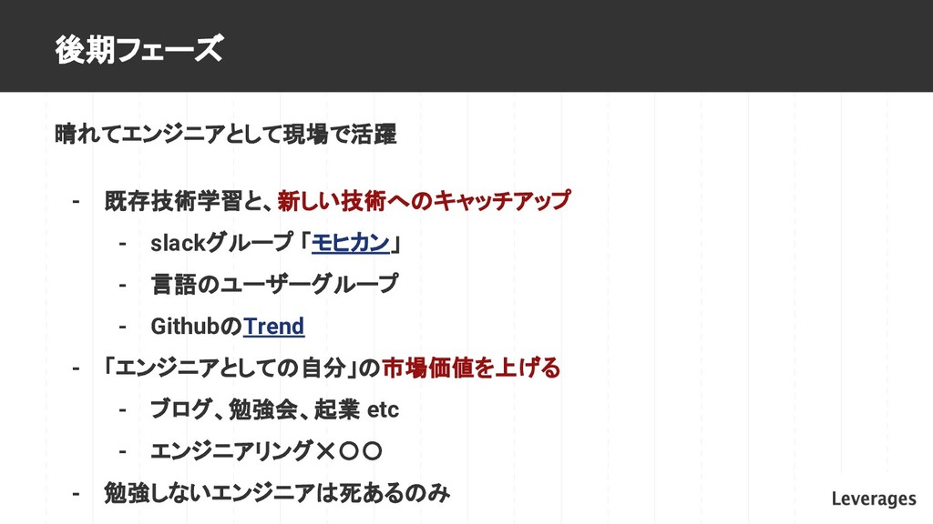 後期フェーズ 晴れてエンジニアとして現場で活躍 - 既存技術学習と、新しい技術へのキャッチアップ - slackグループ 「モヒカン」 - 言語のユーザーグループ -