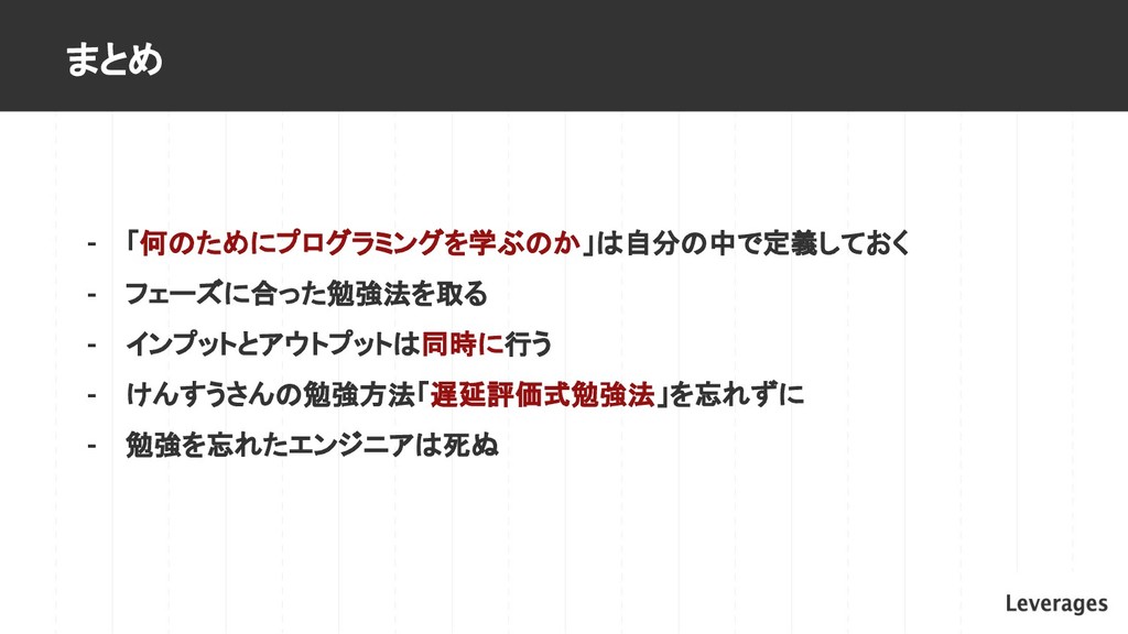 まとめ - 「何のためにプログラミングを学ぶのか」は自分の中で定義しておく - フェーズに合った勉強法を取る - インプットとアウトプットは同時に行う - けんすうさんの勉強方法「遅延評価式勉強法」を忘れずに -