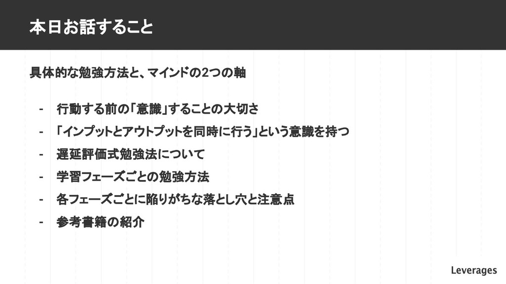 本日お話すること - 行動する前の「意識」することの大切さ - 「インプットとアウトプットを同時に行う」という意識を持つ - 遅延評価式勉強法について - 学習フェーズごとの勉強方法 -