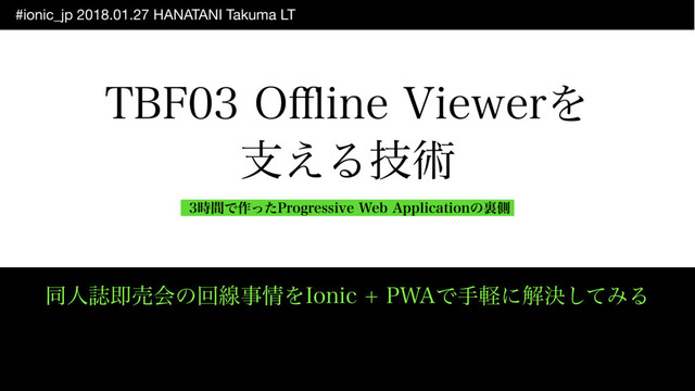 ಉਓࢽଈചձͷճઢࣄΛ*POJD 18"Ͱखܰʹղܾͯ͠ΈΔ ɹ#ionic_jp 2018.01.27 HANATANI Takuma LT 5#'0⒐JOF7JFXFSΛ ࢧ͑Δٕज़ ࣌ؒͰ࡞ͬͨ1SPHSFTTJWF8FC"QQMJDBUJPOͷཪଆ