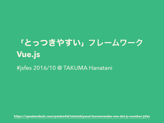 ʮͱ͖͍ͬͭ͢ʯϑϨʔϜϫʔΫ Vue.js #jsfes 2016/10 @ TAKUMA Hanatani https://speakerdeck.com/potato4d/totutukiyasui-huremuwaku-vue-dot-js-number-jsfes