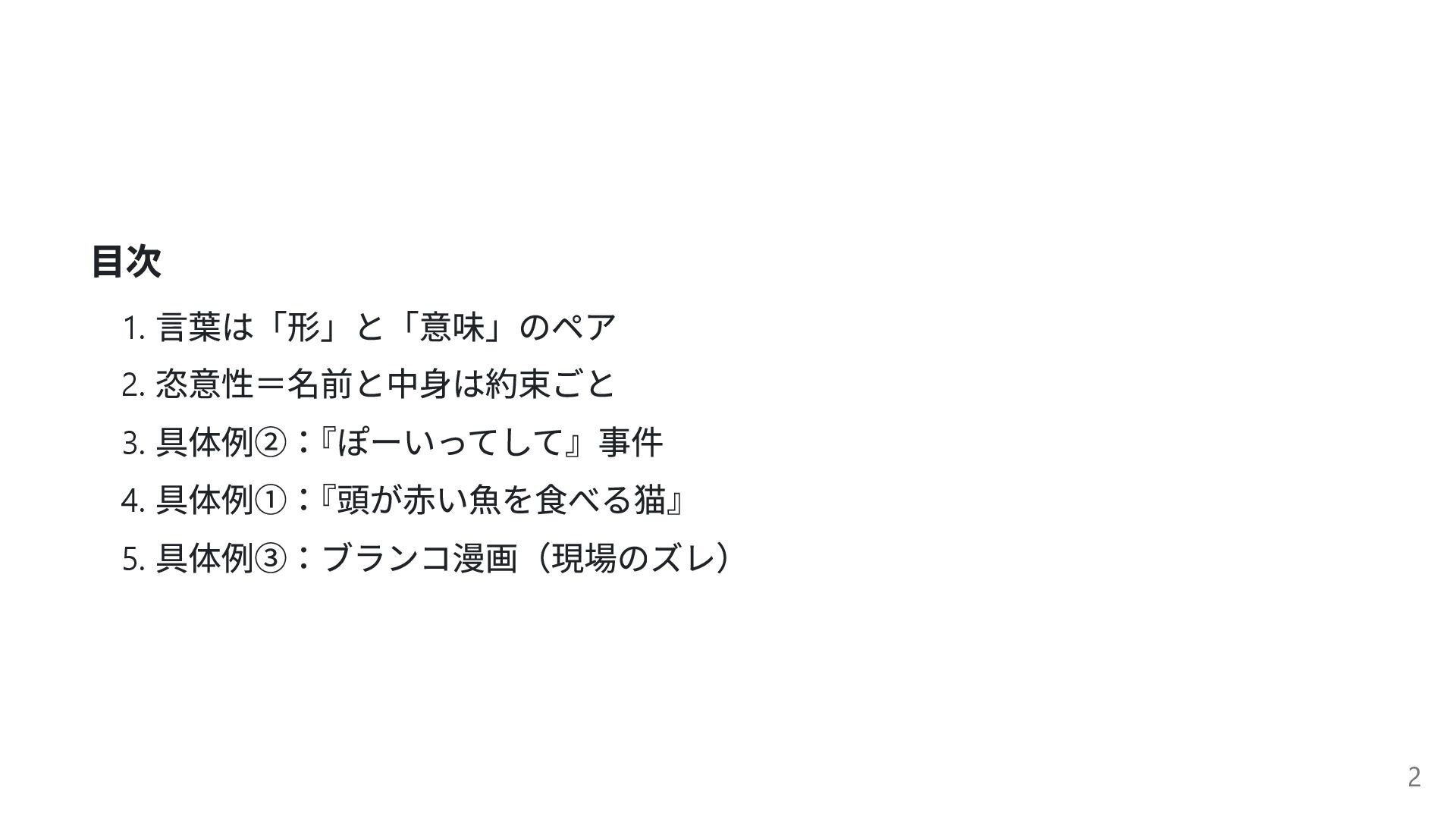 目次 1. 言葉は「形」と「意味」のペア 2. 恣意性=名前と中身は約束ごと 3. 具体例②: 『ぽーいってして』事件 4. 具体例①: