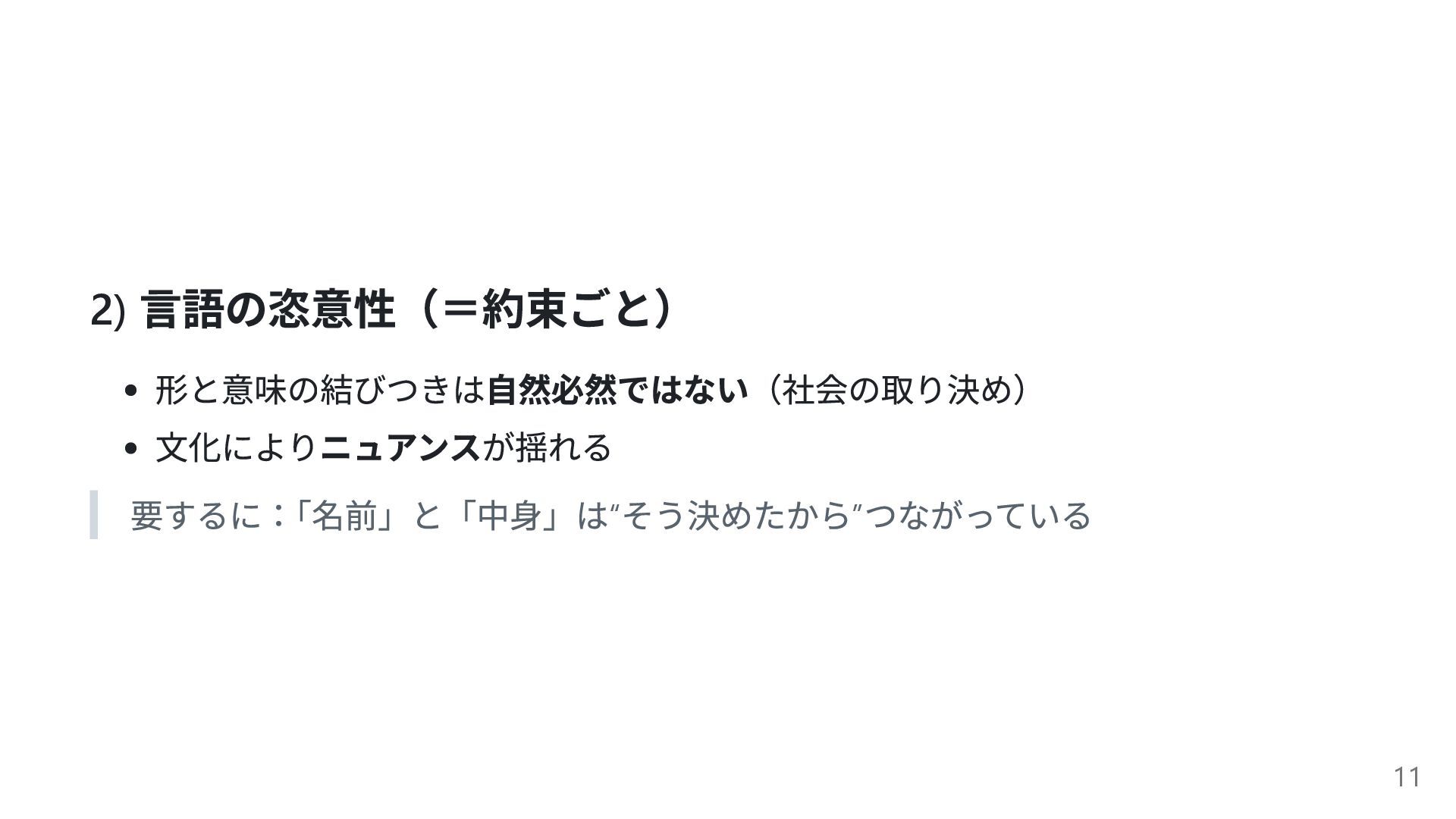 2) 言語の恣意性(=約束ごと) 形と意味の結びつきは自然必然ではない(社会の取り決め) 文化によりニュアンスが揺れる 要するに: 「名前」と「中身」は“ そう決めたから” つながっている 11