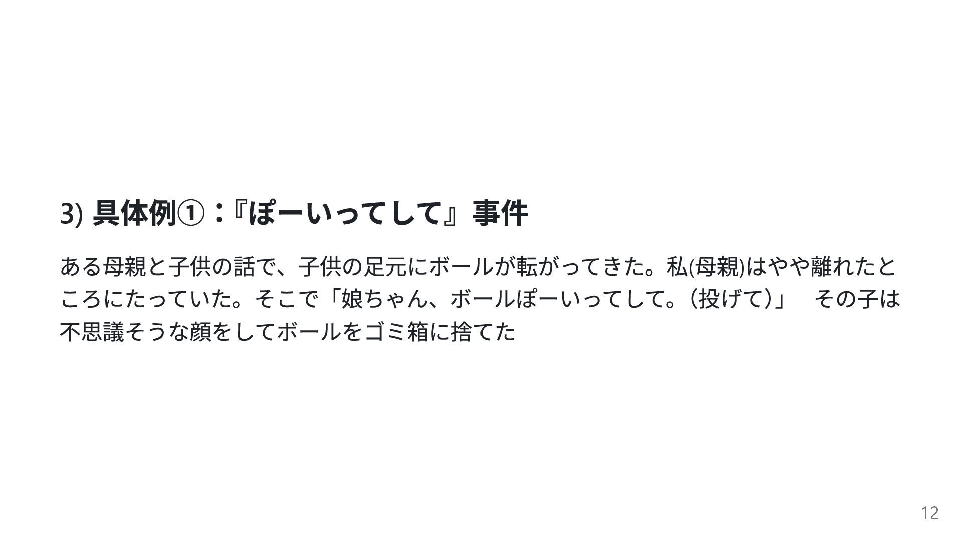 3) 具体例①: 『ぽーいってして』事件 ある母親と子供の話で、子供の足元にボールが転がってきた。私( 母親) はやや離れたと ころにたっていた。そこで「娘ちゃん、ボールぽーいってして。 (投げて) 」