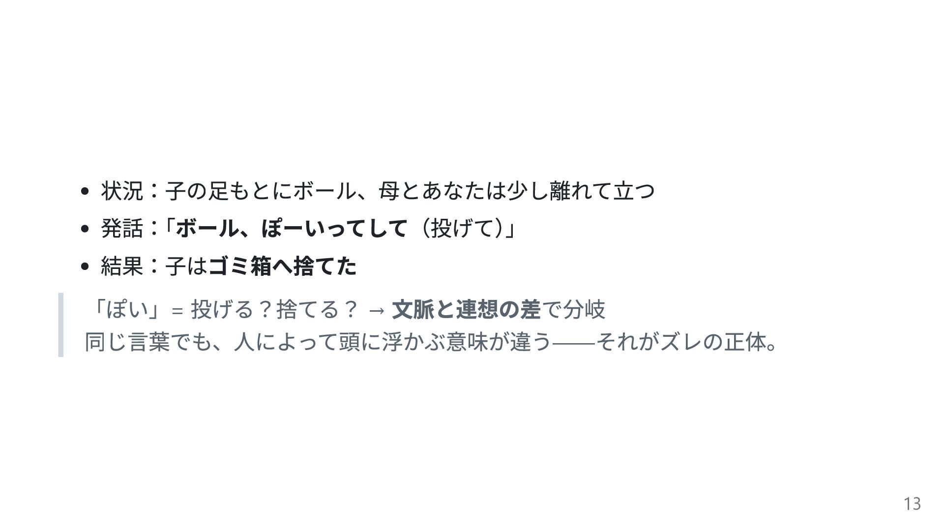 状況:子の足もとにボール、母とあなたは少し離れて立つ 発話: 「ボール、ぽーいってして(投げて) 」 結果:子はゴミ箱へ捨てた 「ぽい」= 投げる?捨てる? → 文脈と連想の差で分岐 同じ言葉でも、人によって頭に浮かぶ意味が違う――