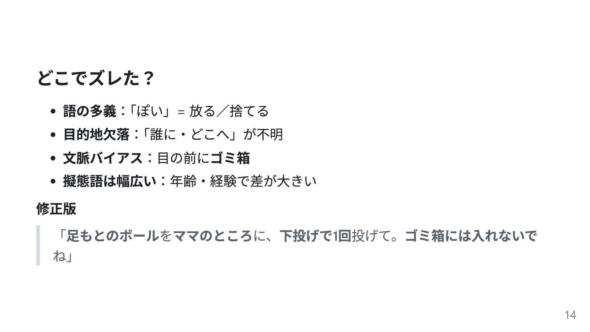 どこでズレた? 語の多義: 「ぽい」= 放る/捨てる 目的地欠落: 「誰に・どこへ」が不明 文脈バイアス:目の前にゴミ箱 擬態語は幅広い:年齢・経験で差が大きい 修正版 「足もとのボールをママのところに、下投げで1
