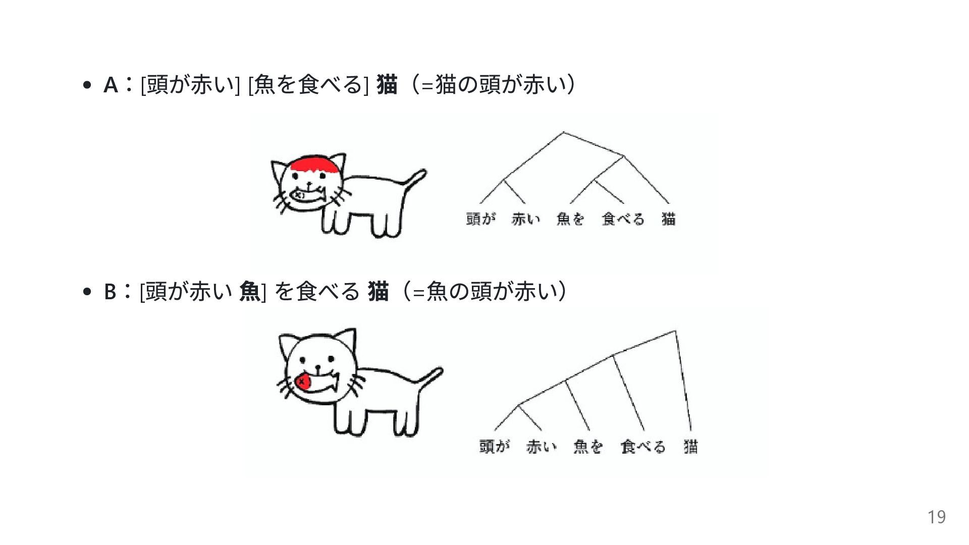 A :[ 頭が赤い] [ 魚を食べる] 猫(= 猫の頭が赤い) B :[ 頭が赤い