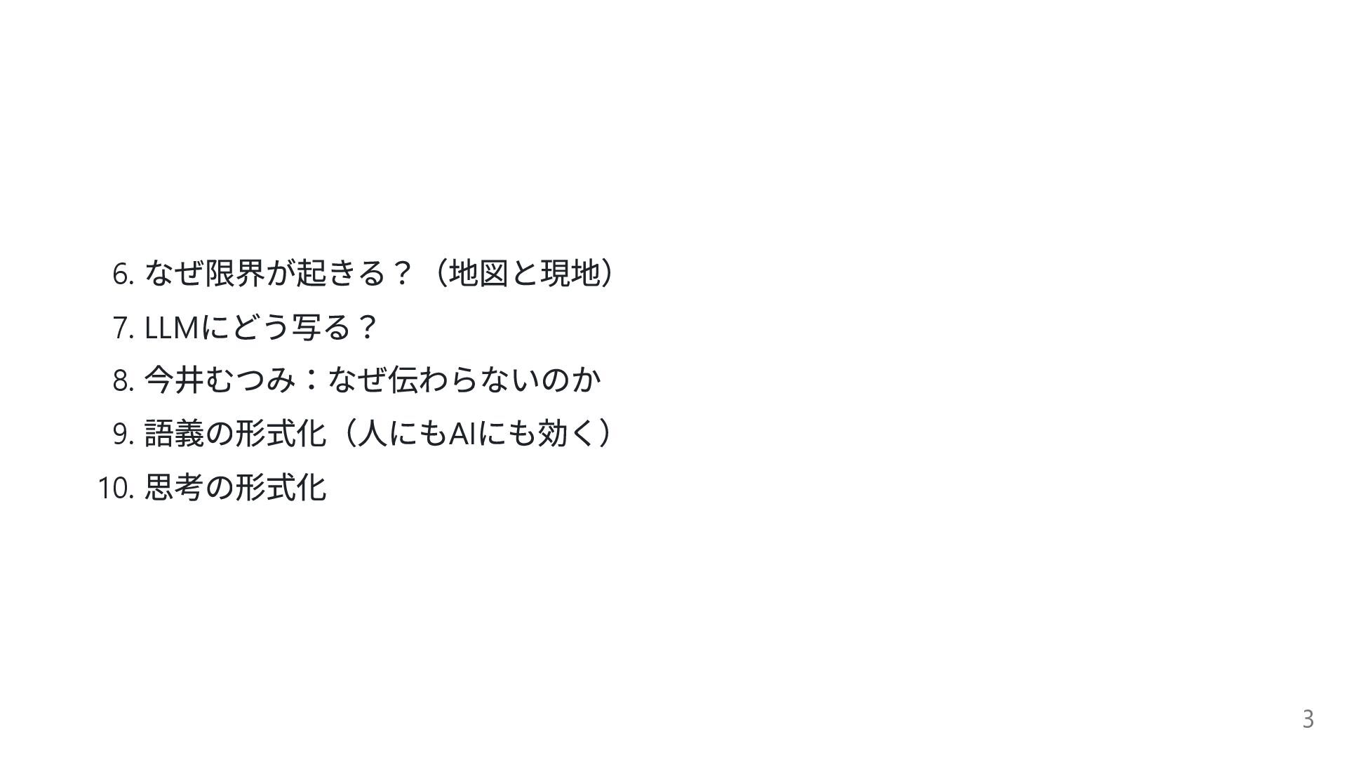 6. なぜ限界が起きる?(地図と現地) 7. LLM にどう写る? 8. 今井むつみ:なぜ伝わらないのか 9. 語義の形式化(人にもAI にも効く)