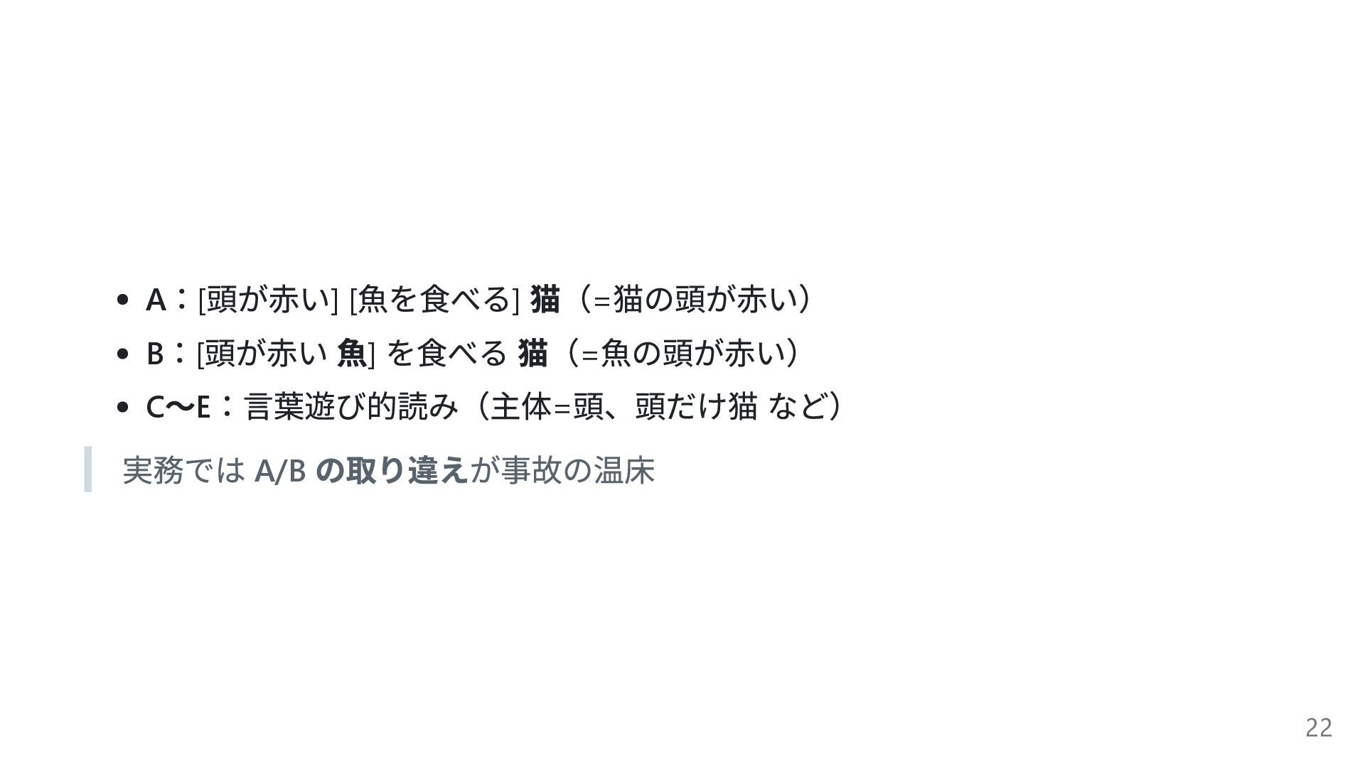 魚] を食べる 猫(= 魚の頭が赤い) C 〜E :言葉遊び的読み(主体= 頭、頭だけ猫 など) 実務では A/B の取り違えが事故の温床 22