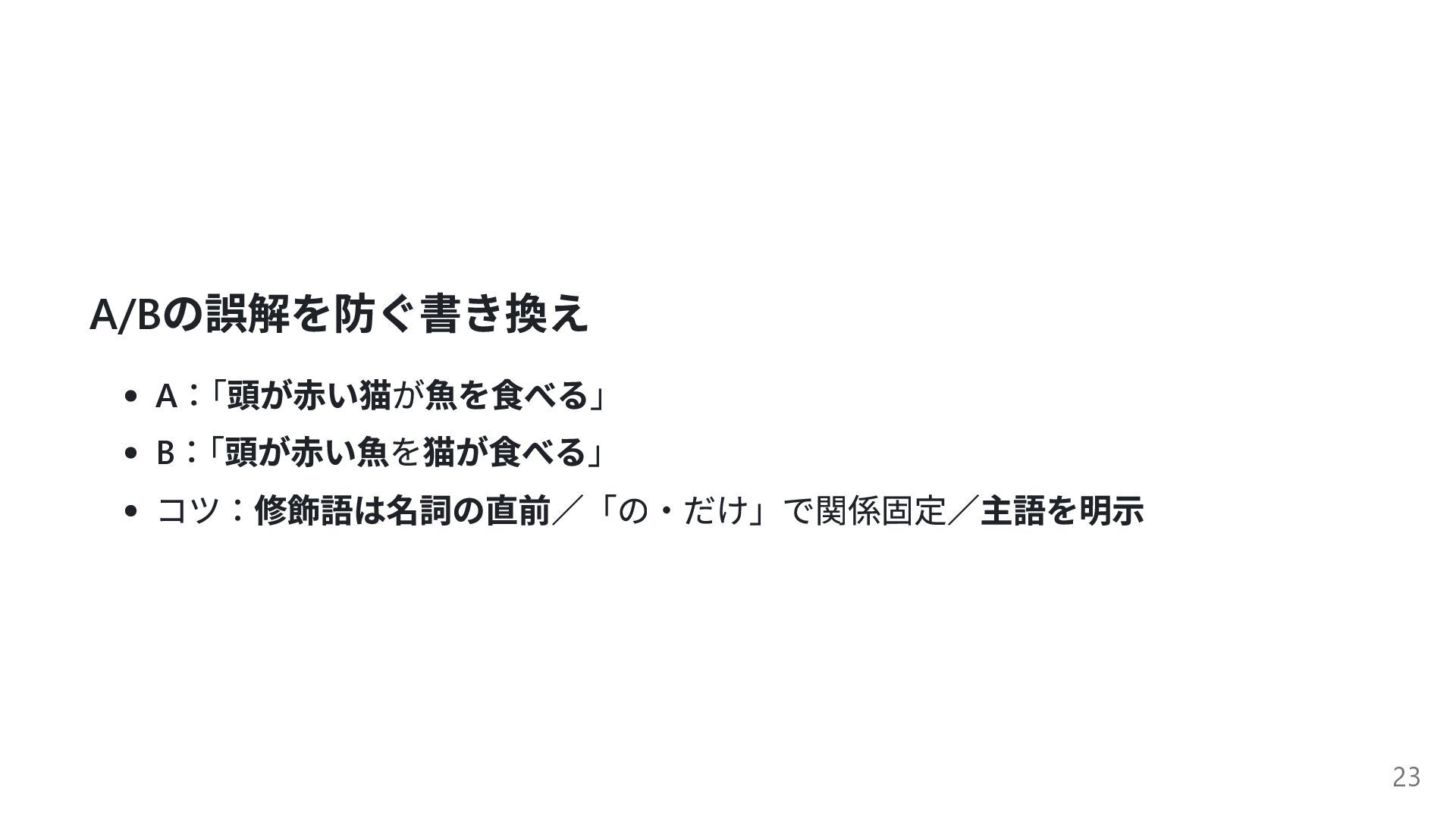 A/B の誤解を防ぐ書き換え A : 「頭が赤い猫が魚を食べる」 B : 「頭が赤い魚を猫が食べる」 コツ:修飾語は名詞の直前/「の・だけ」で関係固定/主語を明示 23