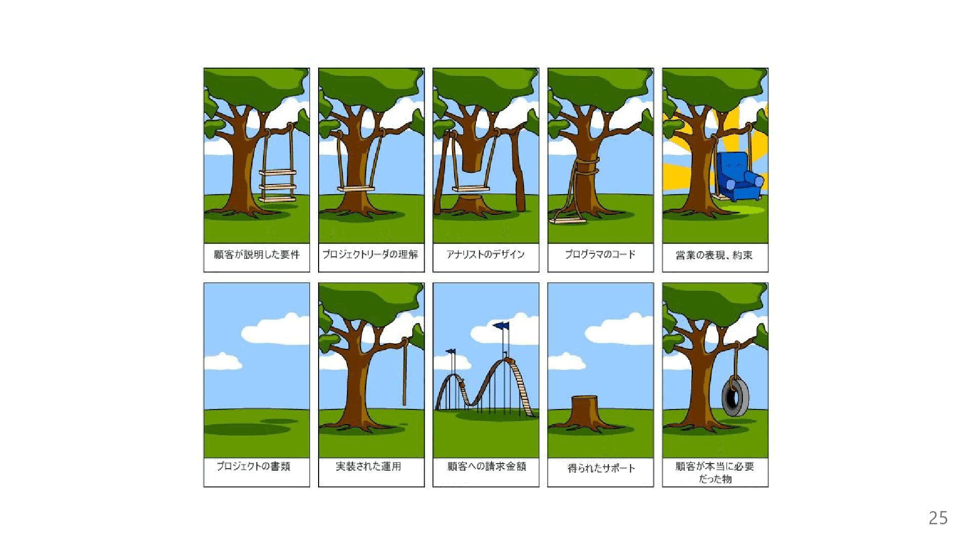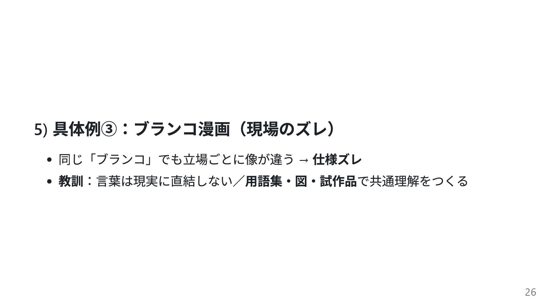 5) 具体例③:ブランコ漫画(現場のズレ) 同じ「ブランコ」でも立場ごとに像が違う → 仕様ズレ 教訓:言葉は現実に直結しない/用語集・図・試作品で共通理解をつくる 26
