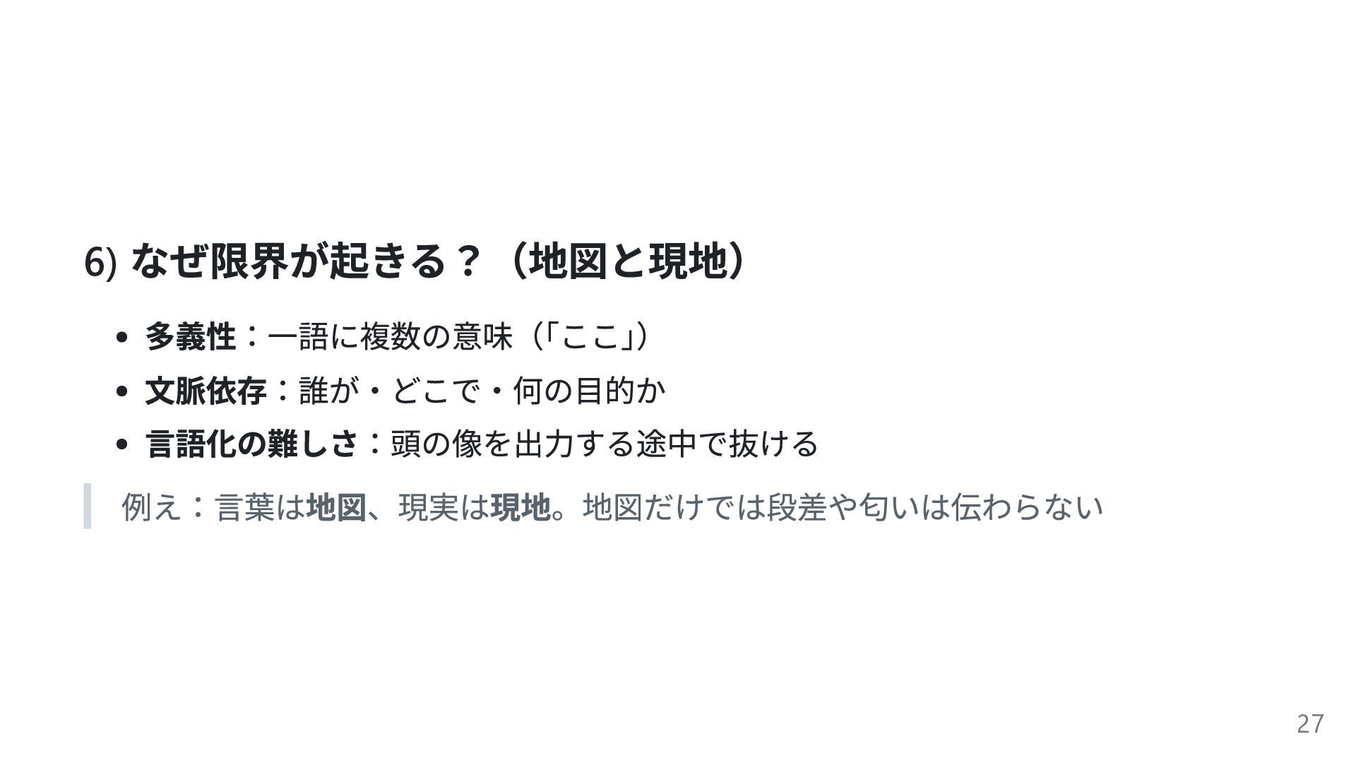6) なぜ限界が起きる?(地図と現地) 多義性:一語に複数の意味( 「ここ」 ) 文脈依存:誰が・どこで・何の目的か 言語化の難しさ:頭の像を出力する途中で抜ける 例え:言葉は地図、現実は現地。地図だけでは段差や匂いは伝わらない 27
