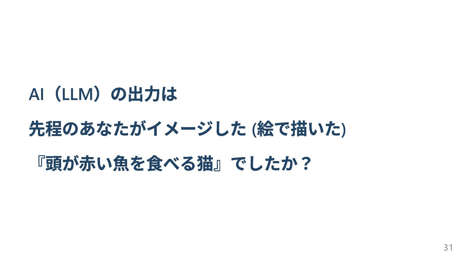 AI (LLM )の出力は 先程のあなたがイメージした ( 絵で描いた) 『頭が赤い魚を食べる猫』でしたか? 31