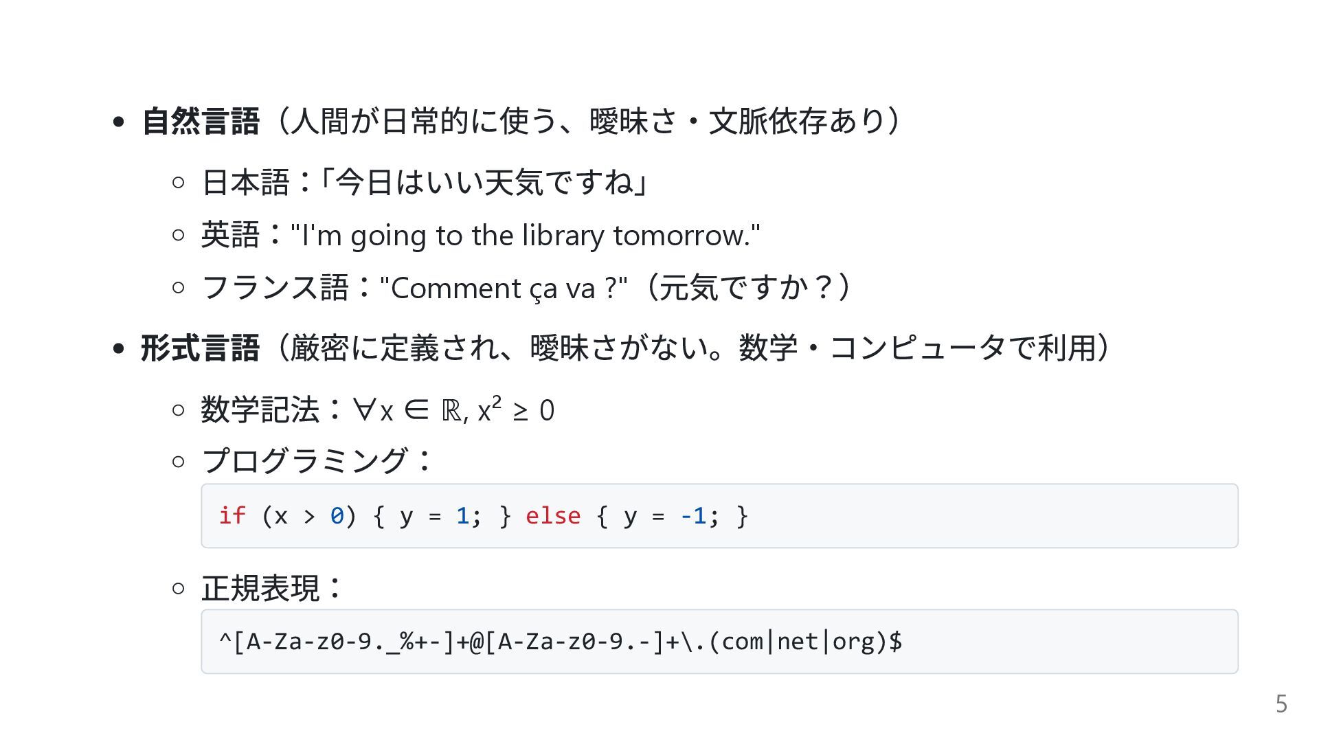 ça va ?" (元気ですか?) 形式言語(厳密に定義され、曖昧さがない。数学・コンピュータで利用) 数学記法:∀x ∈ ℝ, x² ≥ 0 プログラミング: if (x > 0) { y = 1; } else { y = -1; } 正規表現: ^[A-Za-z0-9._%+-]+@[A-Za-z0-9.-]+\.(com|net|org)$ 5