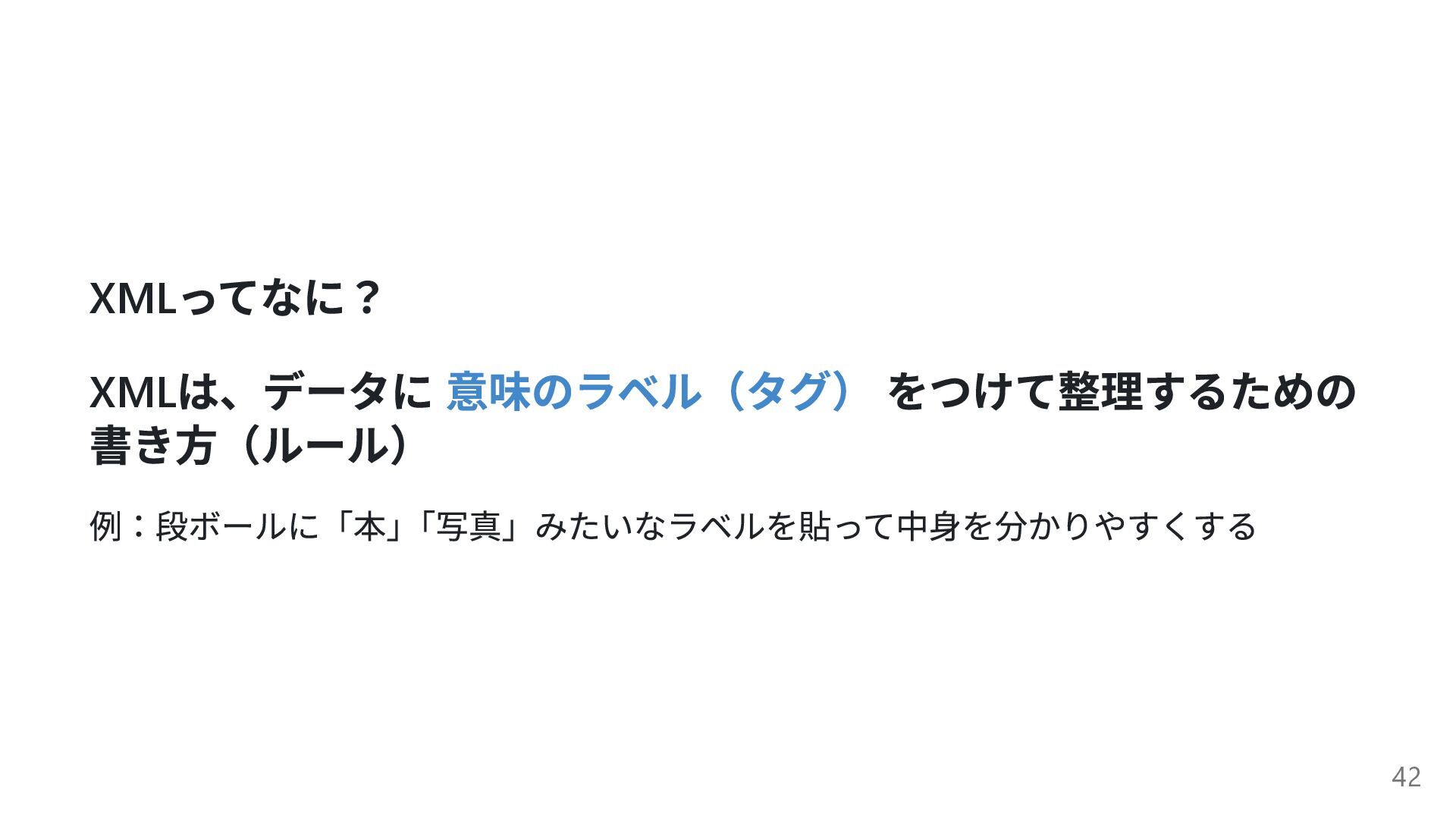 XML ってなに? XML は、データに 意味のラベル(タグ) をつけて整理するための 書き方(ルール) 例:段ボールに「本」 「写真」みたいなラベルを貼って中身を分かりやすくする 42