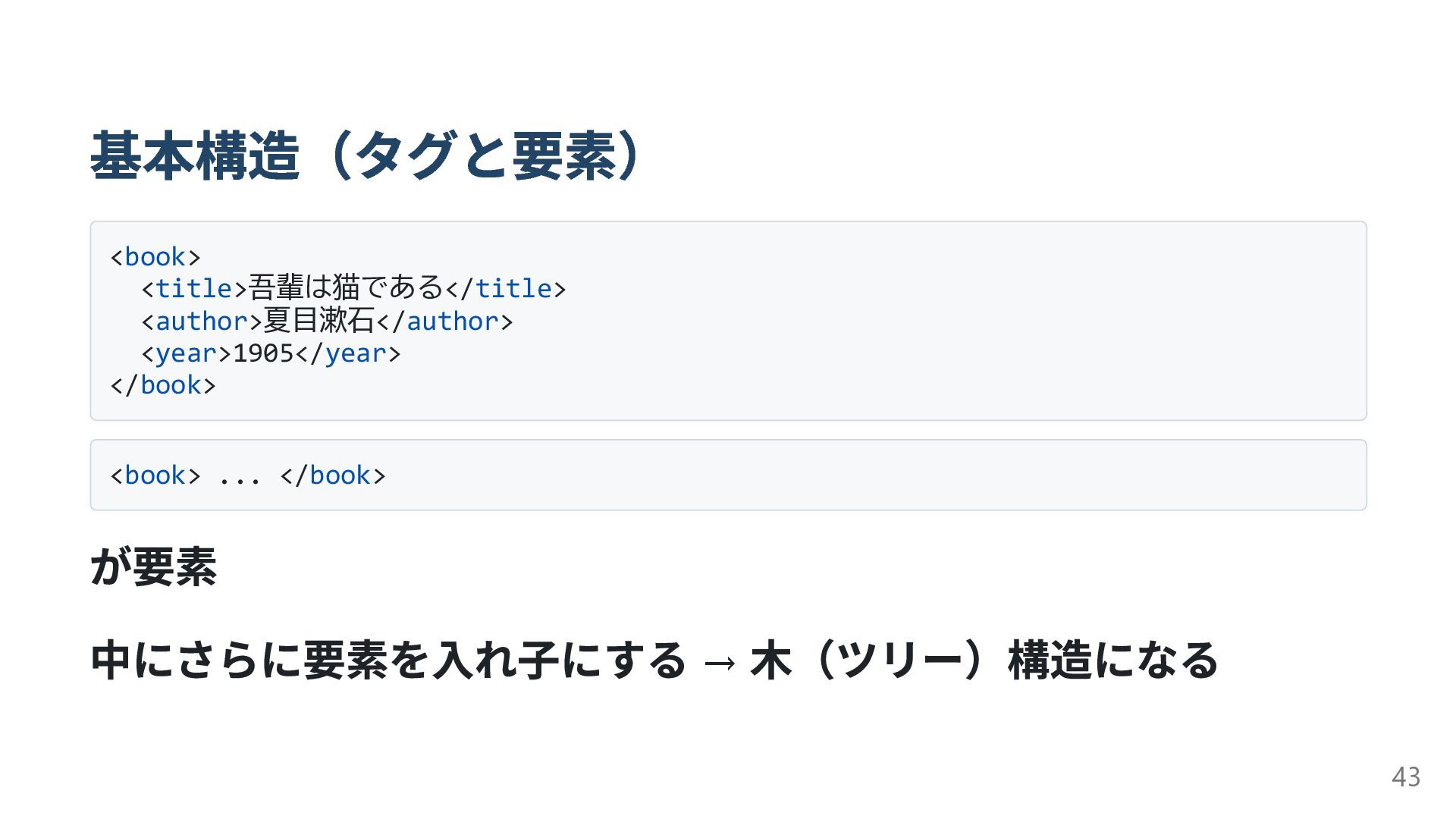 基本構造(タグと要素) <book> <title>吾輩は猫である</title> <author>夏目漱石</author> <year>1905</year> </book> <book> ... </book> が要素