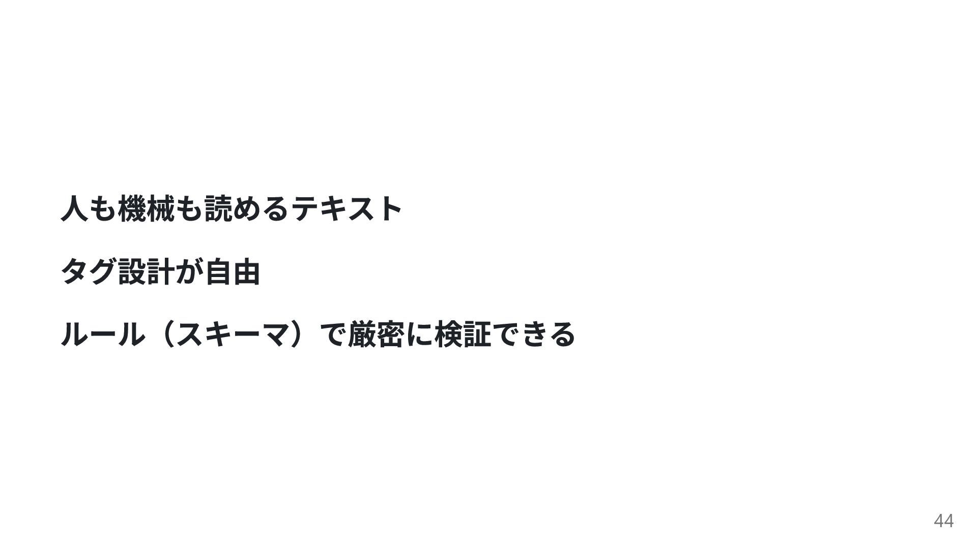 人も機械も読めるテキスト タグ設計が自由 ルール(スキーマ)で厳密に検証できる 44