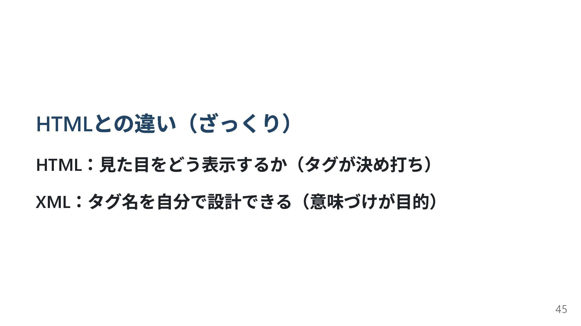 HTML との違い(ざっくり) HTML :見た目をどう表示するか(タグが決め打ち) XML :タグ名を自分で設計できる(意味づけが目的) 45