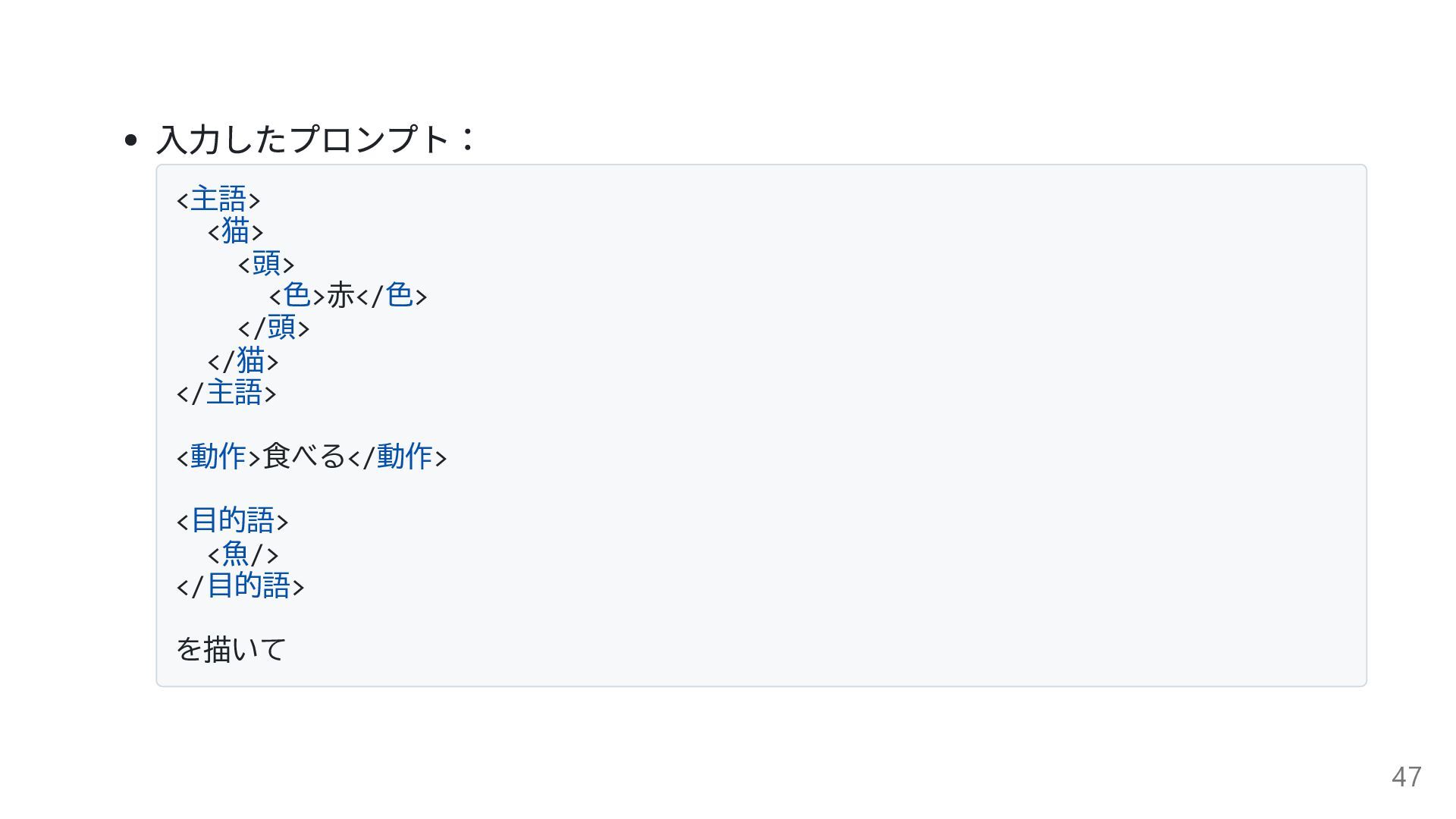 入力したプロンプト: <主語> <猫> <頭> <色>赤</色> </頭> </猫> </主語> <動作>食べる</動作> <目的語>