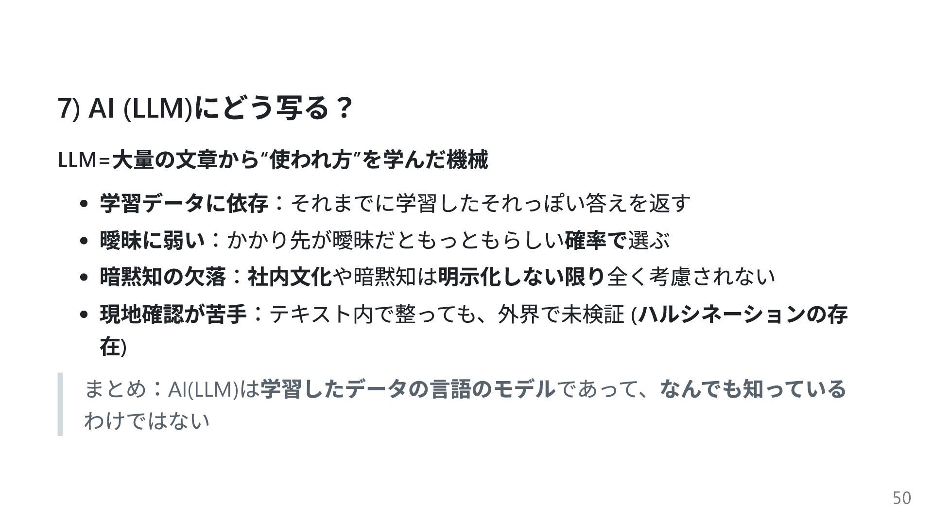 暗黙知の欠落:社内文化や暗黙知は明示化しない限り全く考慮されない 現地確認が苦手:テキスト内で整っても、外界で未検証 ( ハルシネーションの存 在) まとめ:AI(LLM) は学習したデータの言語のモデルであって、なんでも知っている わけではない 50