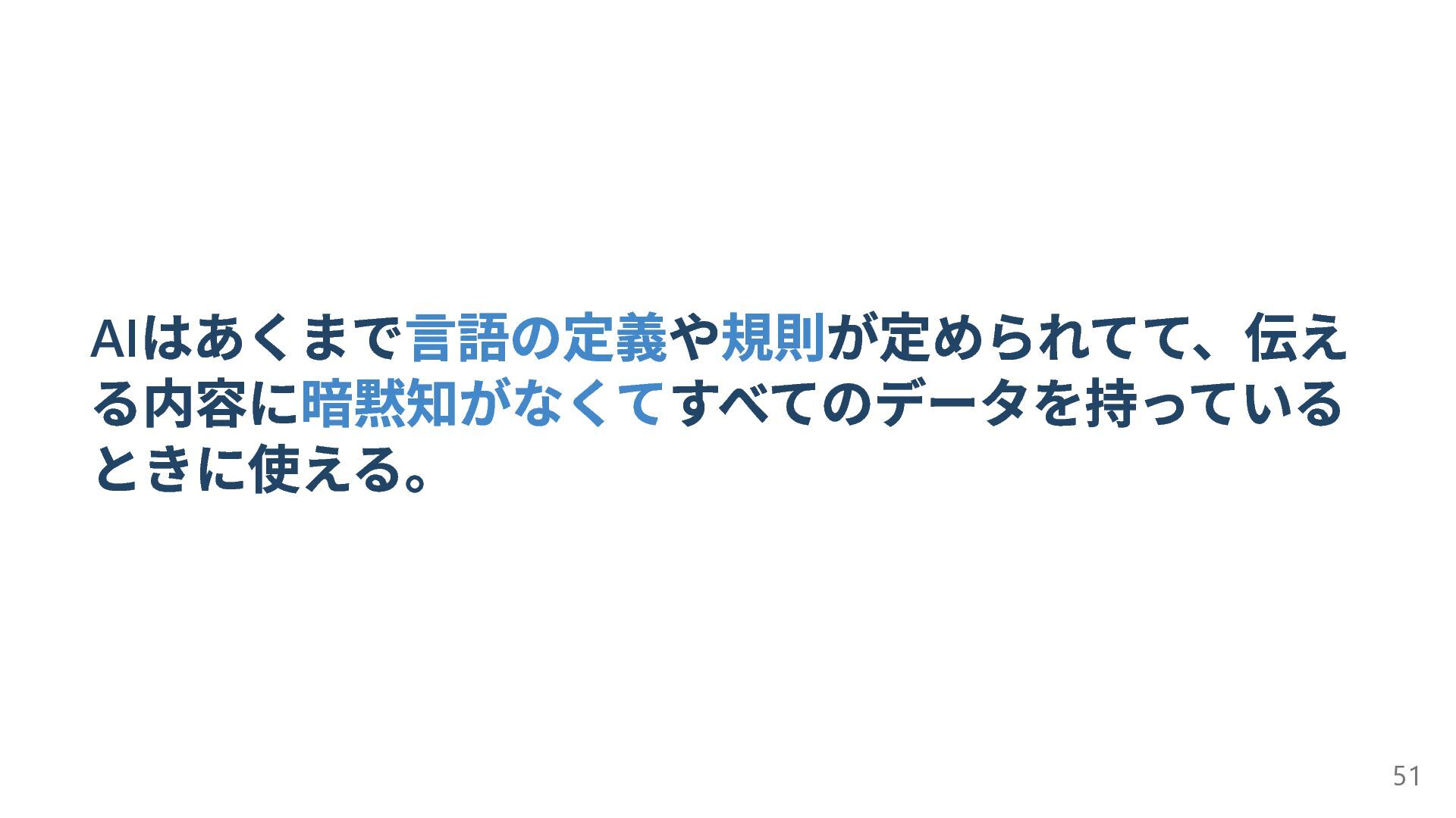 AI はあくまで言語の定義や規則が定められてて、伝え る内容に暗黙知がなくてすべてのデータを持っている ときに使える。 51