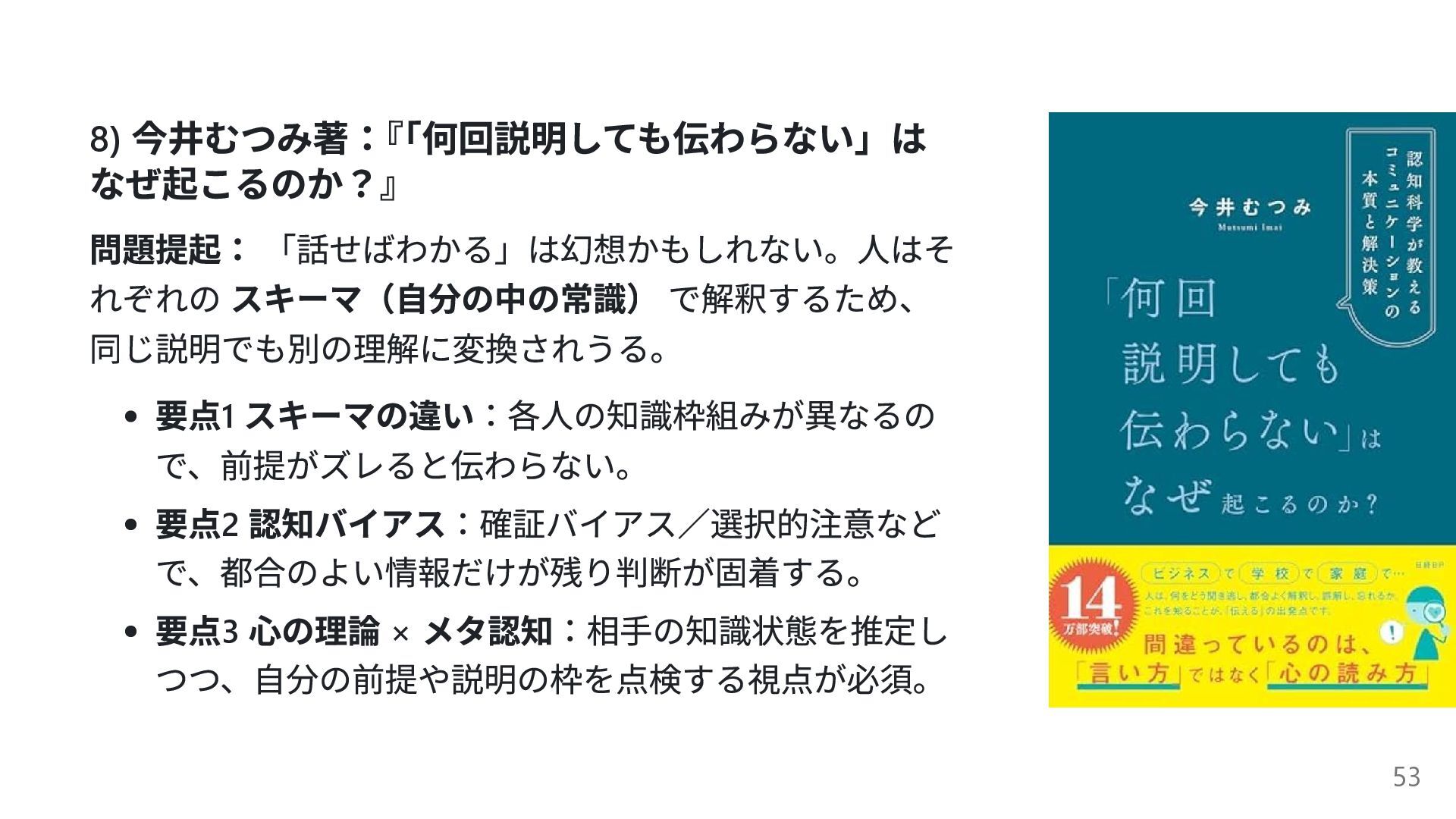 同じ説明でも別の理解に変換されうる。 要点1 スキーマの違い:各人の知識枠組みが異なるの で、前提がズレると伝わらない。 要点2 認知バイアス:確証バイアス/選択的注意など で、都合のよい情報だけが残り判断が固着する。 要点3 心の理論 × メタ認知:相手の知識状態を推定し つつ、自分の前提や説明の枠を点検する視点が必須。 53