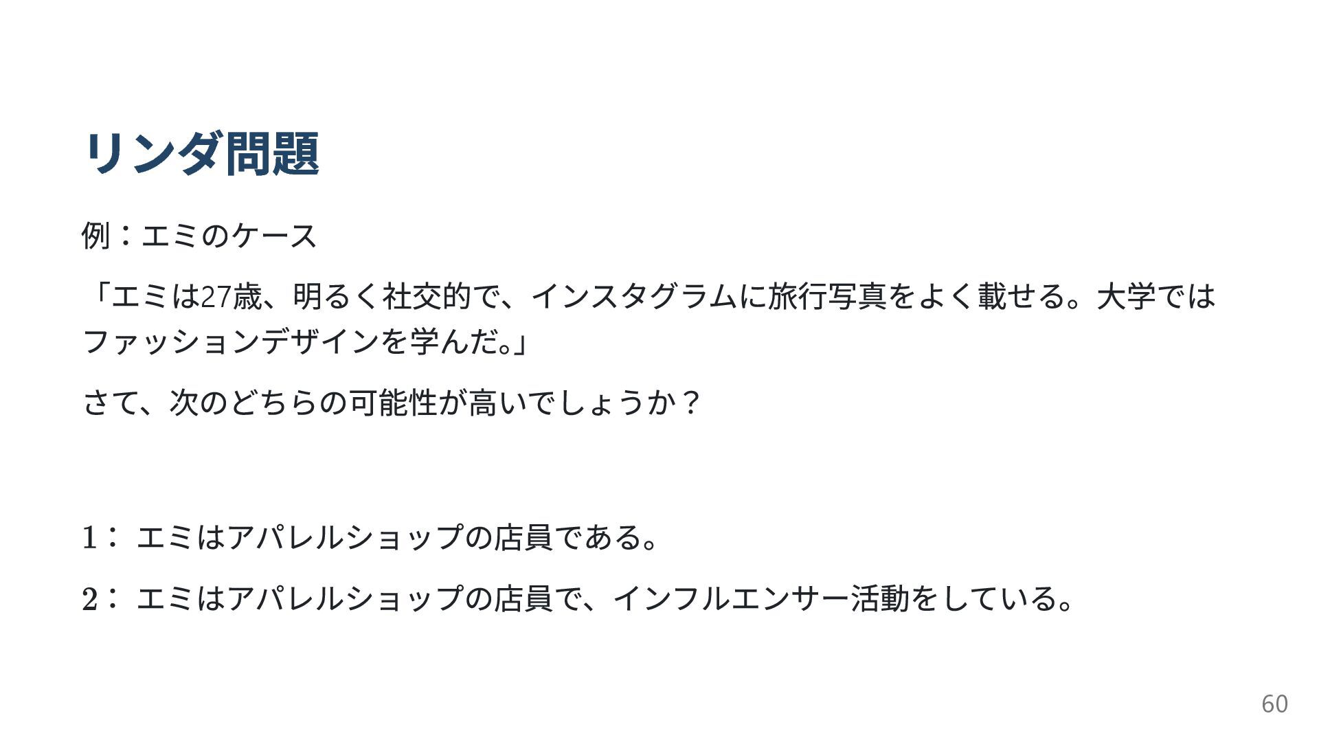 リンダ問題 例:エミのケース 「エミは27 歳、明るく社交的で、インスタグラムに旅行写真をよく載せる。大学では ファッションデザインを学んだ。 」 さて、次のどちらの可能性が高いでしょうか? : エミはアパレルショップの店員である。 :