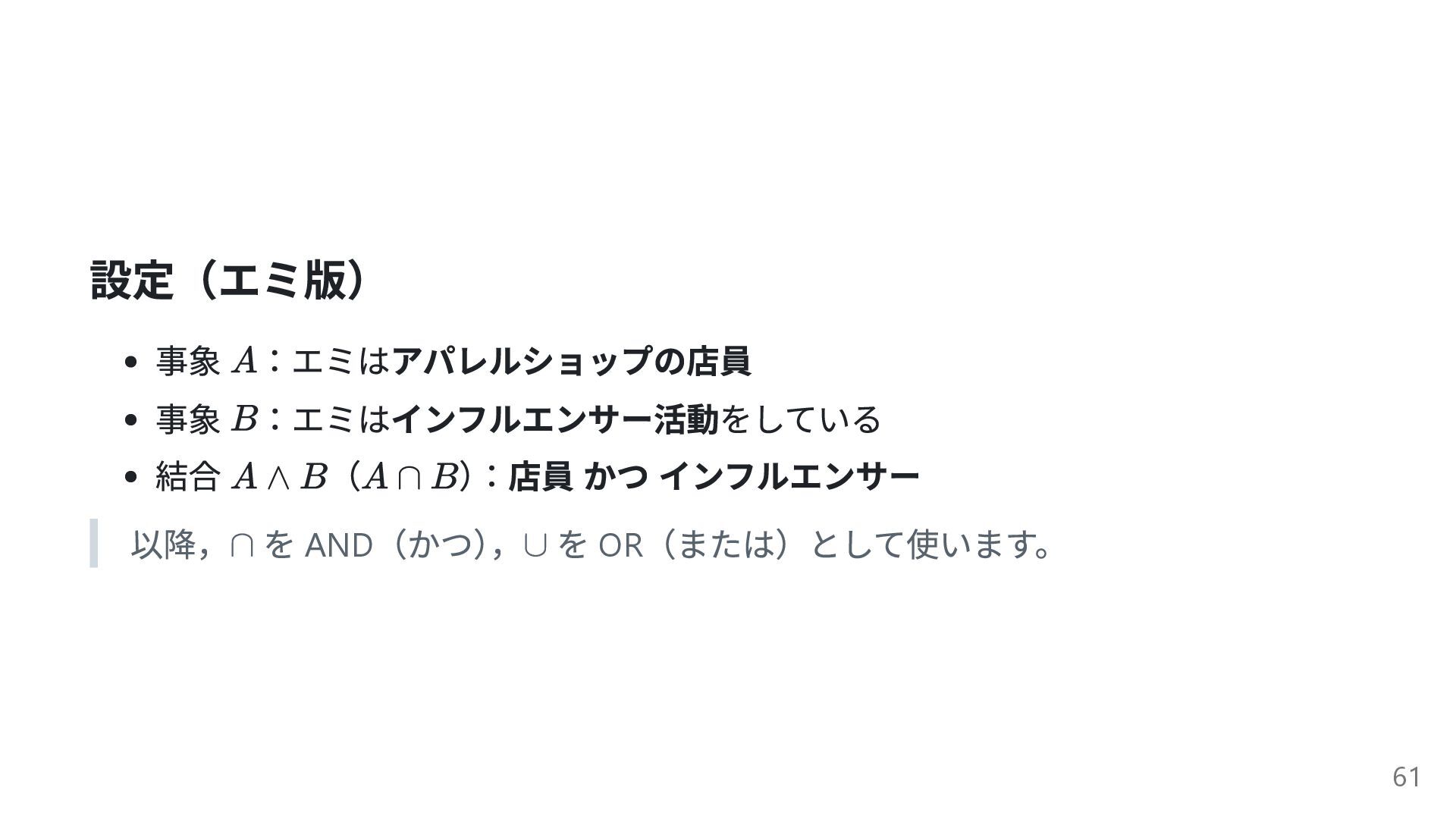 設定(エミ版) 事象 :エミはアパレルショップの店員 事象 :エミはインフルエンサー活動をしている 結合 ( ) :店員 かつ