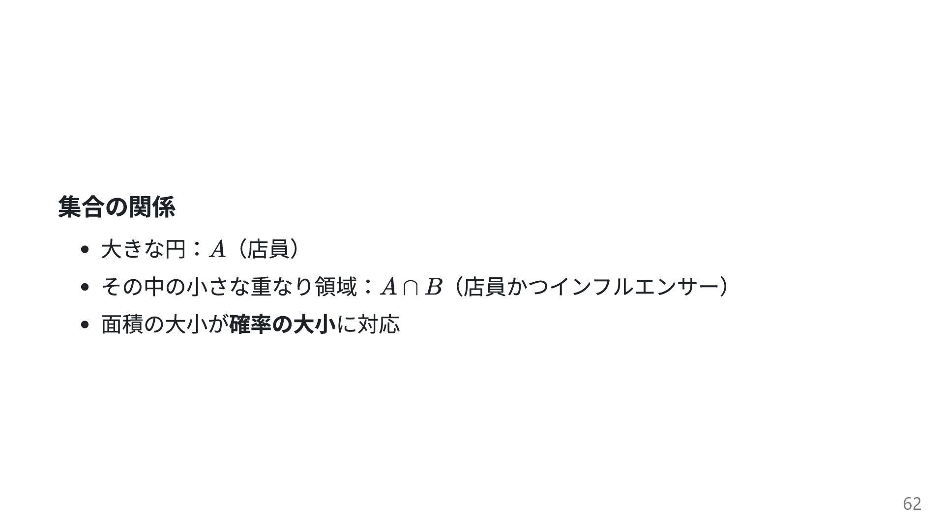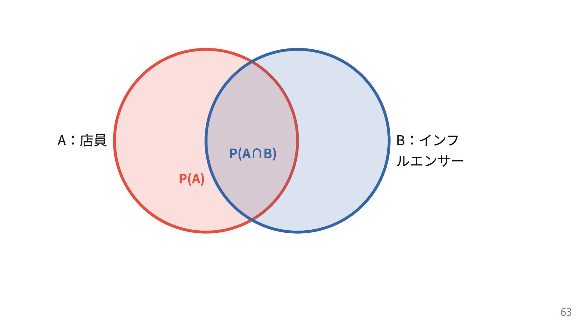 集合の関係 大きな円: (店員) その中の小さな重なり領域: (店員かつインフルエンサー) 面積の大小が確率の大小に対応 62