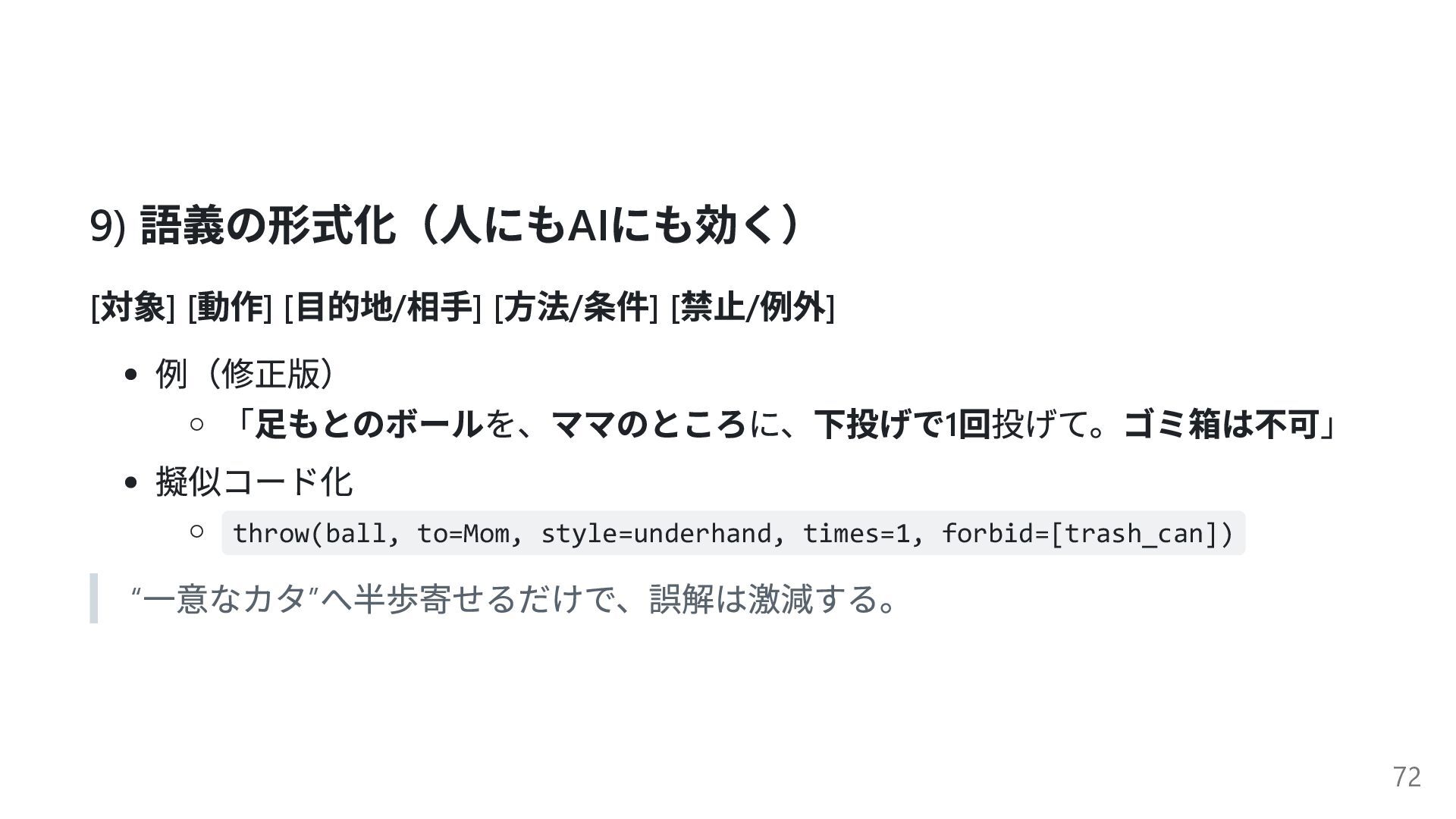[ 方法/ 条件] [ 禁止/ 例外] 例(修正版) 「足もとのボールを、ママのところに、下投げで1 回投げて。ゴミ箱は不可」 擬似コード化 throw(ball, to=Mom, style=underhand, times=1, forbid=[trash_can]) “ 一意なカタ” へ半歩寄せるだけで、誤解は激減する。 72