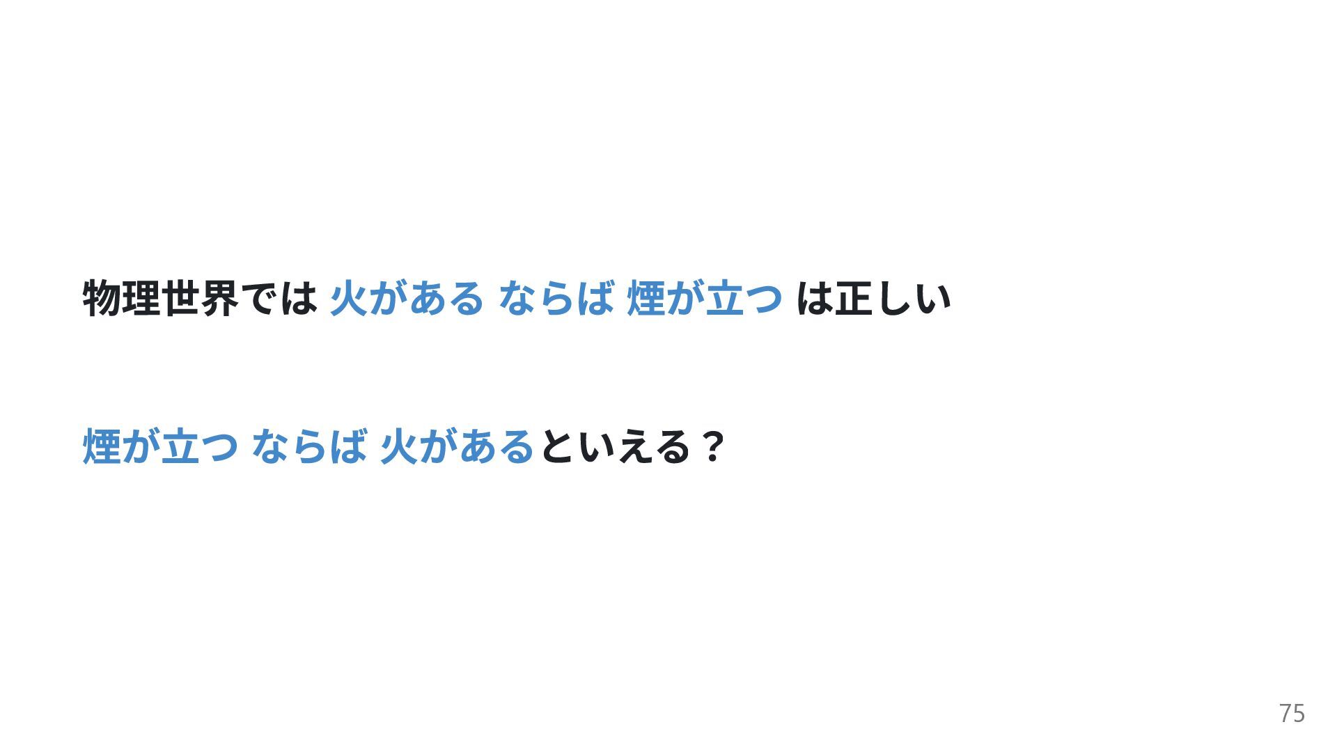 物理世界では 火がある ならば 煙が立つ は正しい 煙が立つ ならば 火があるといえる? 75