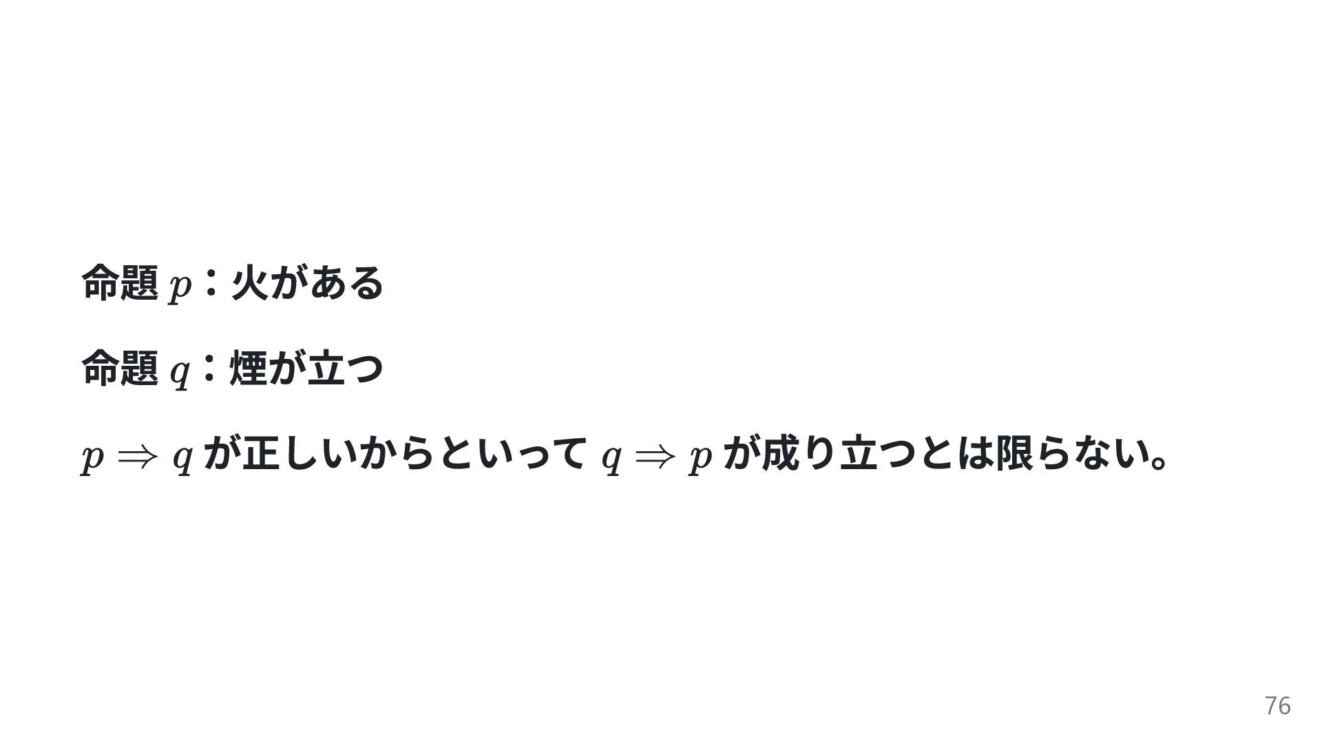 命題 :火がある 命題 :煙が立つ が正しいからといって が成り立つとは限らない。 76