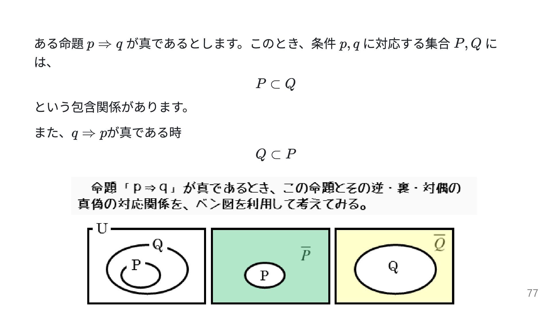 ある命題 が真であるとします。このとき、条件 に対応する集合 に は、 という包含関係があります。 また、 が真である時 77